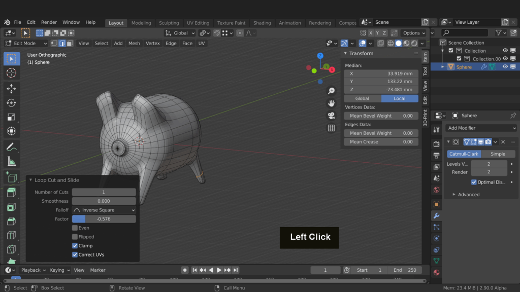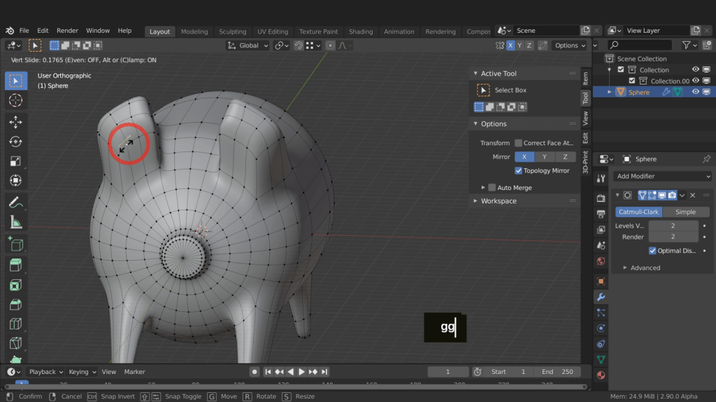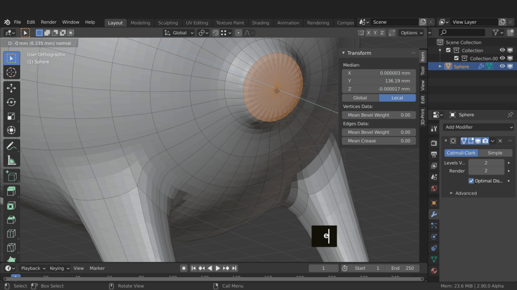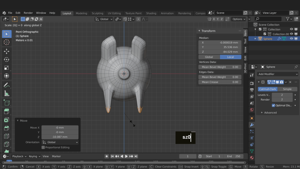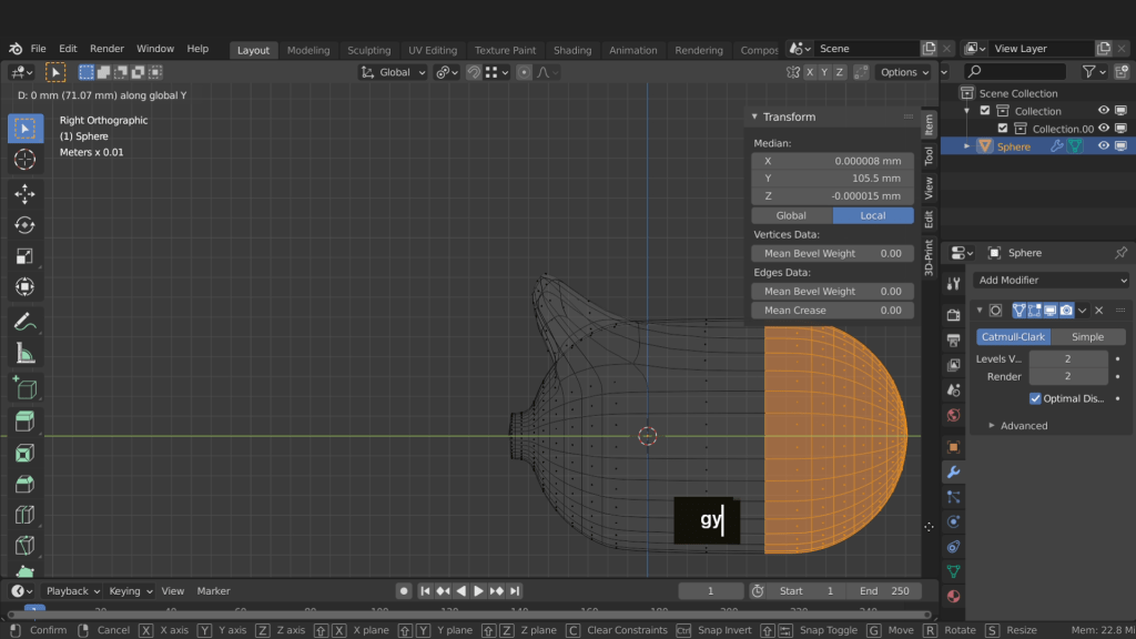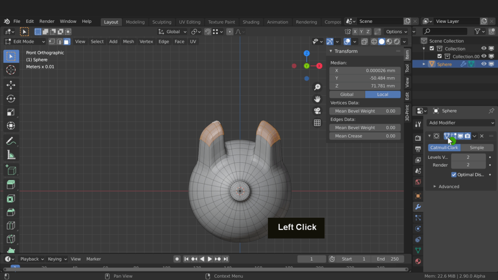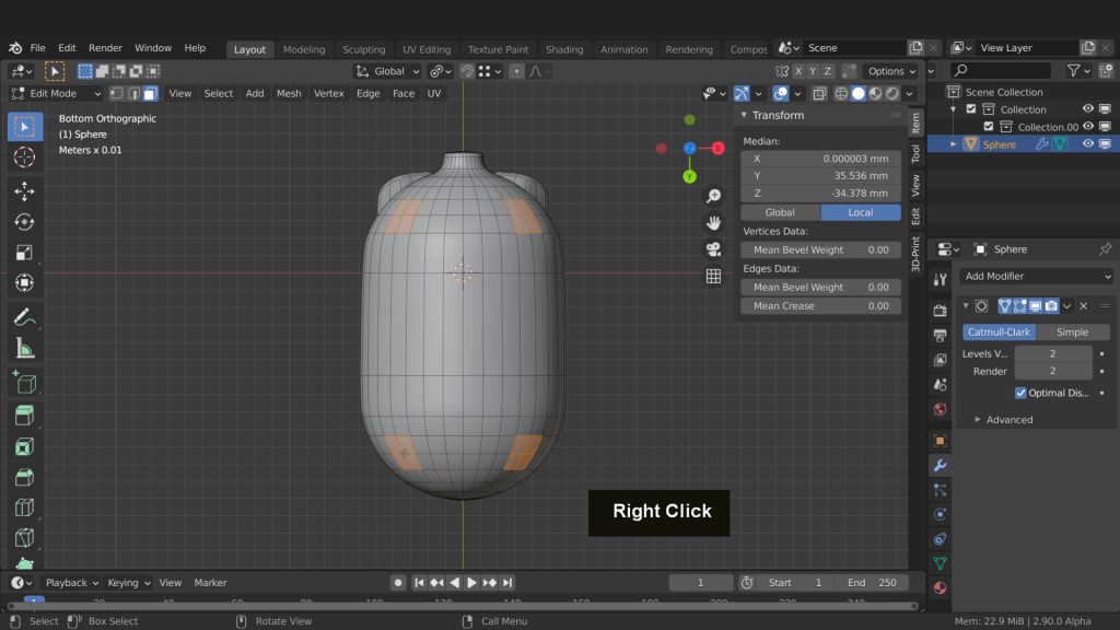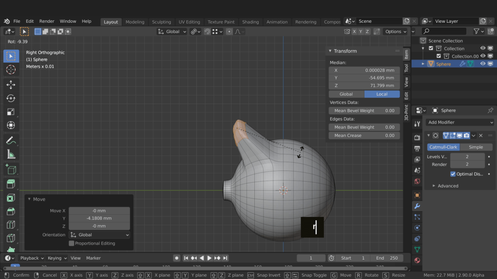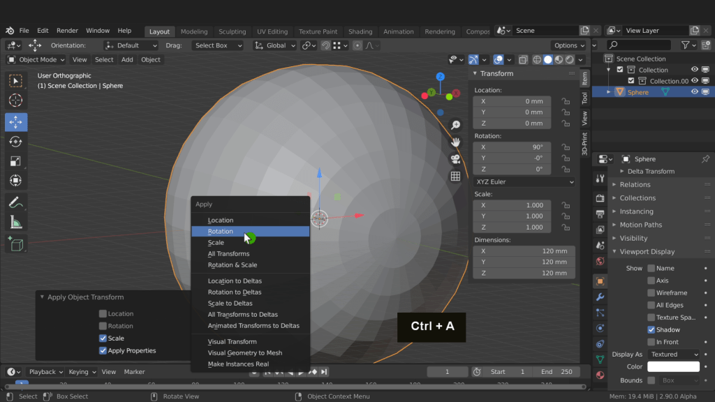 We need to rotate the sphere and have the top facing forward. Press R to rotate, X to rotate around the X axis, input 90 for the amount and press enter to confirm. Press Ctrl + A and apply that non-uniform rotation.