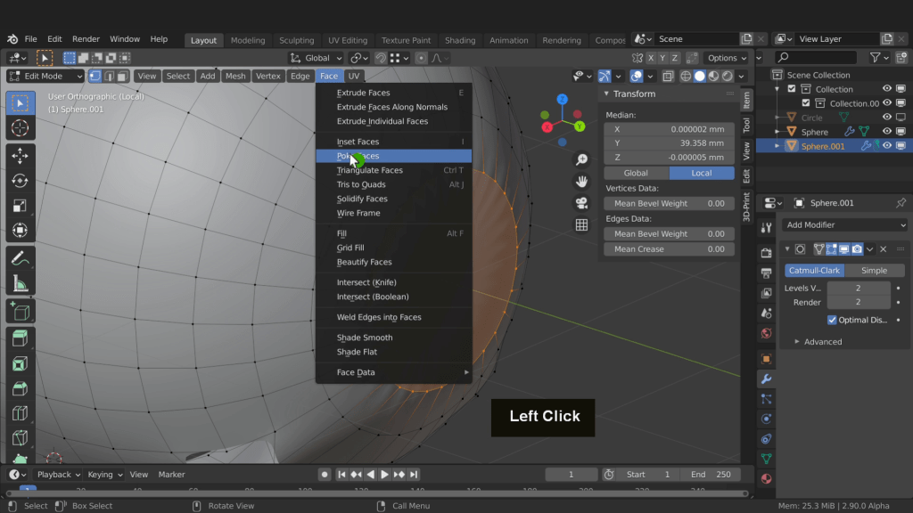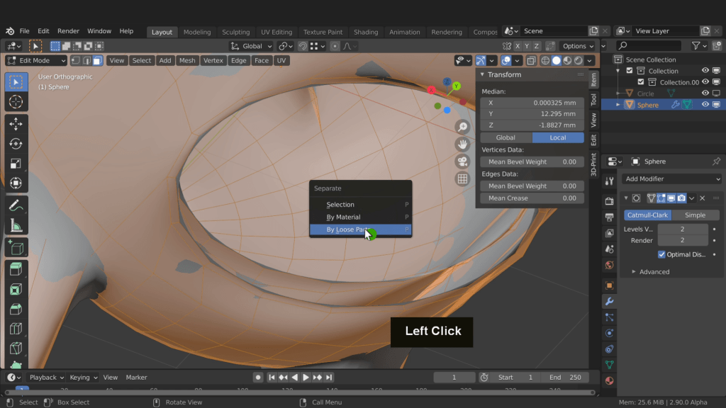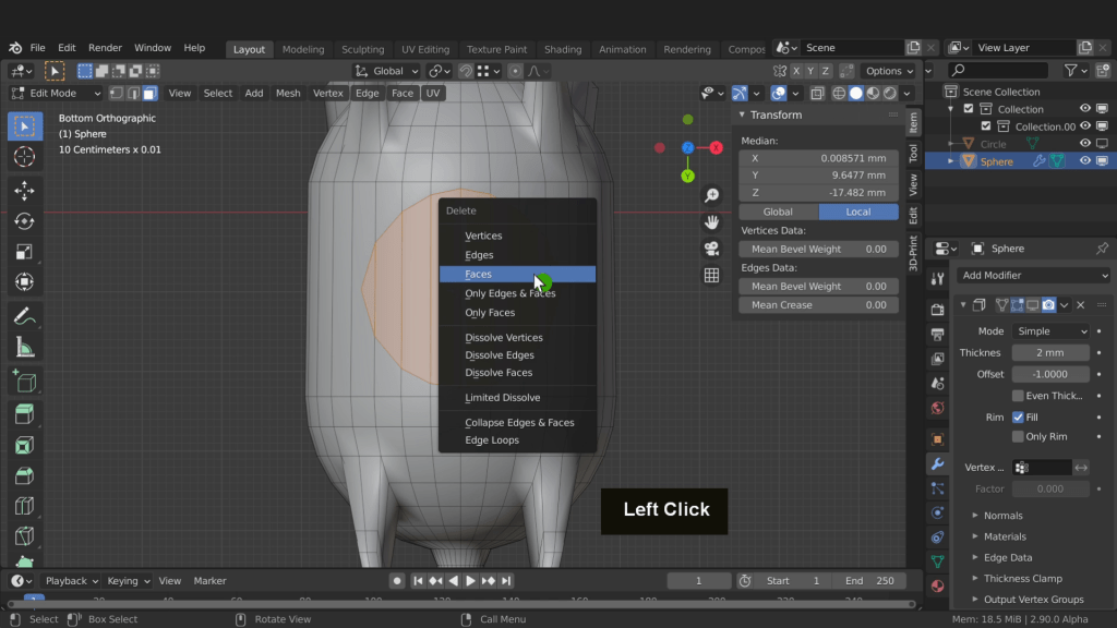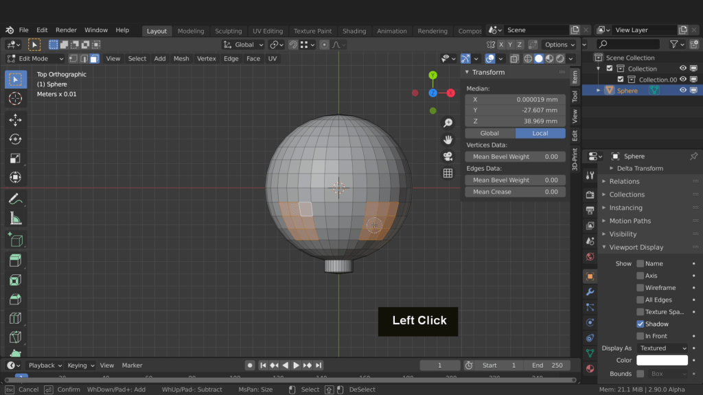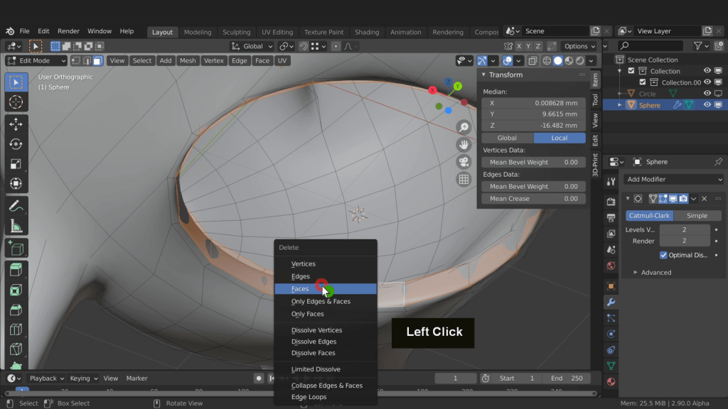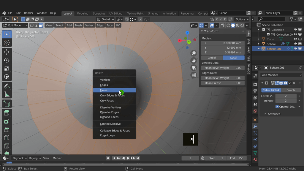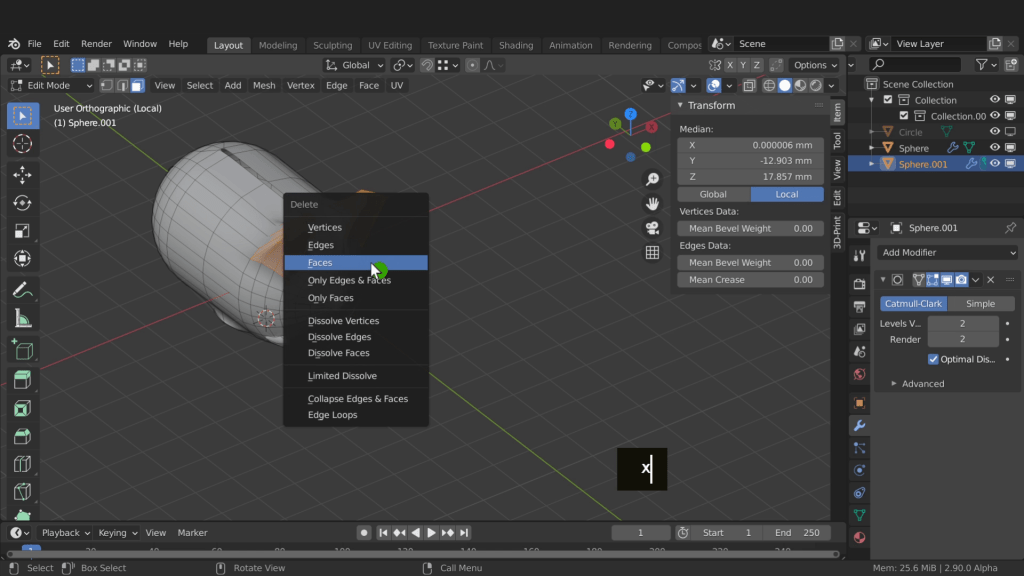 That’s the scene setup and we can now look at modelling. Press A to select everything and press delete. Press Shift + A and from mesh add a UV sphere.
