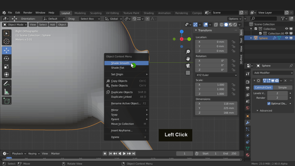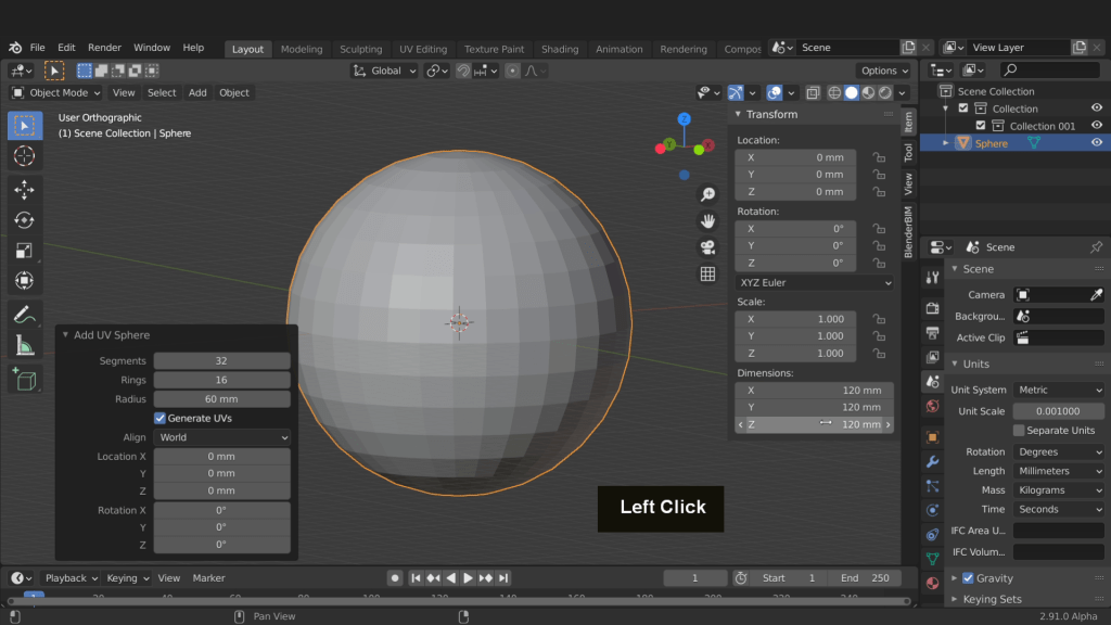 Press the home key to frame all and bring the sphere into view. Open the item tab on the sidebar and check the dimensions are correct. This should read 120 in the X, Y and Z dimension fields.