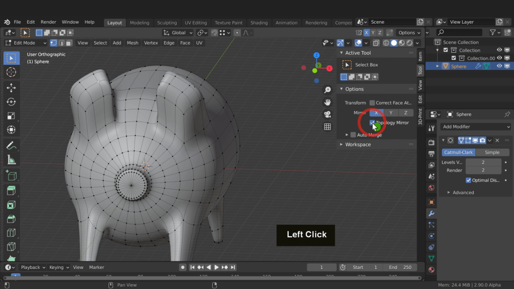 Press the Tab key and come back into edit mode. Press 1 for vertex selection and select this vertex here. Now in the tool tab, in options switch on X mirror. Also check on topology mirror. That way the vertices you move on one side of the origin will mirror across to the other side.