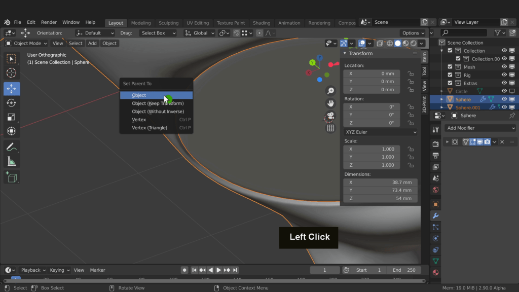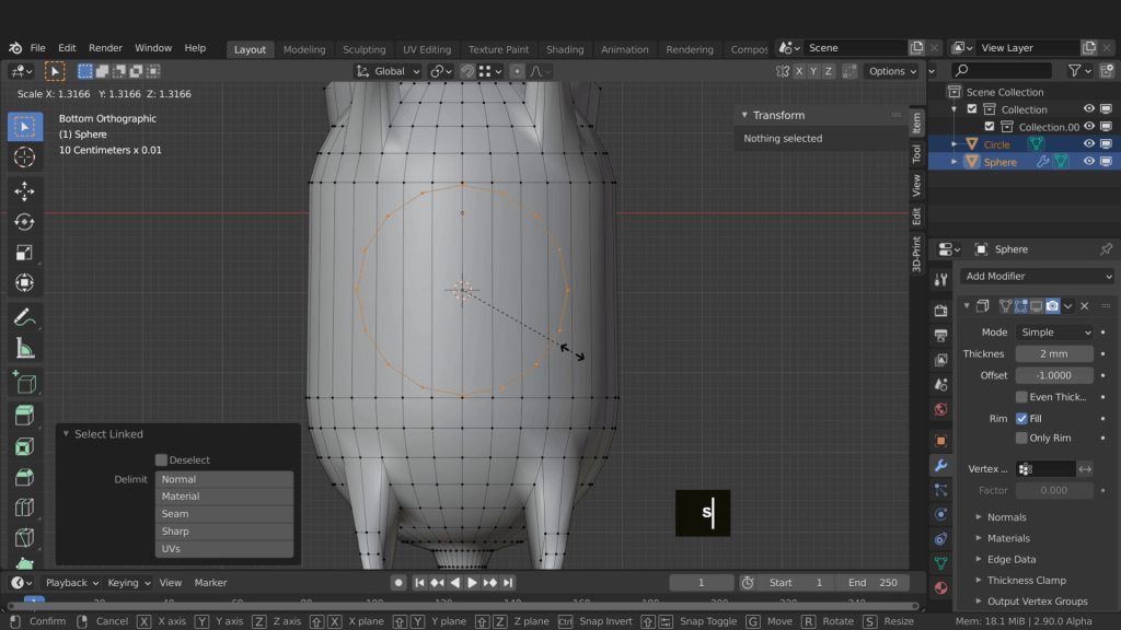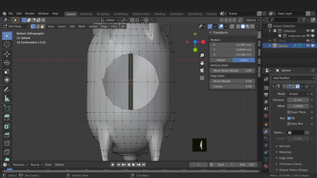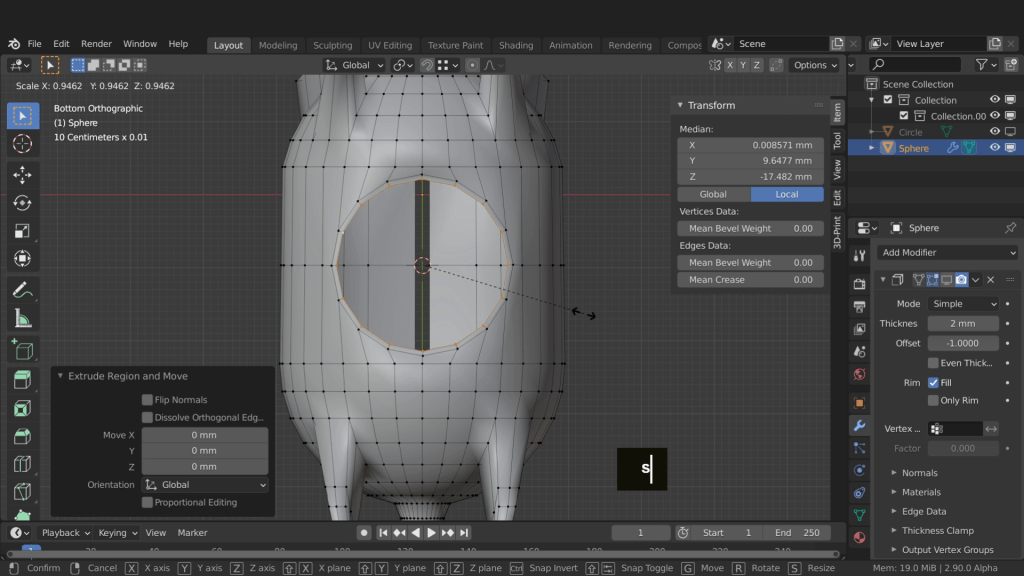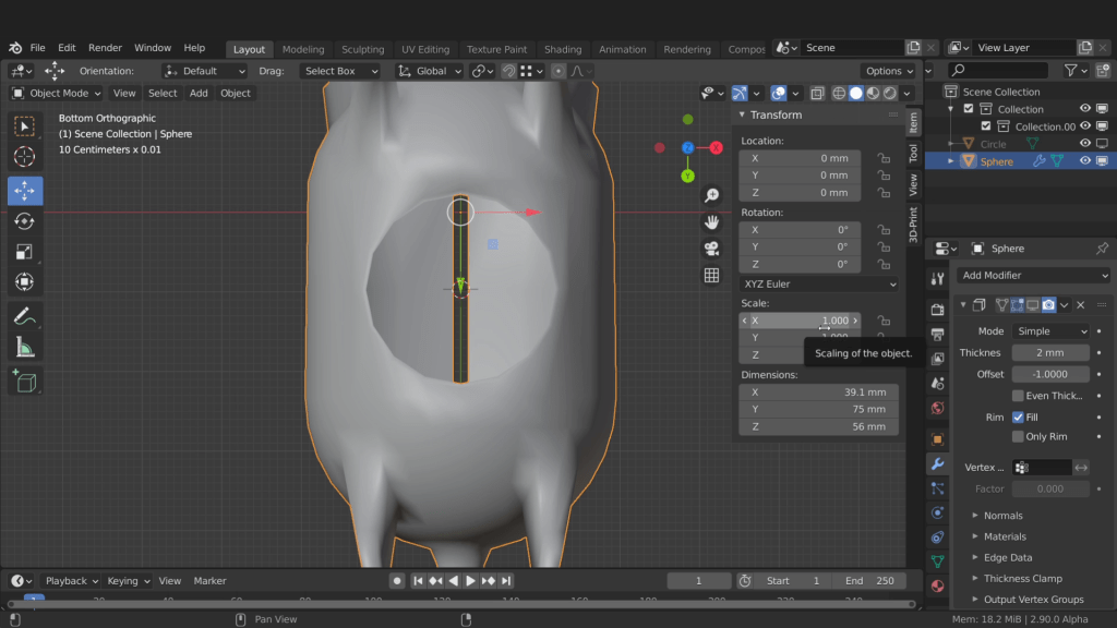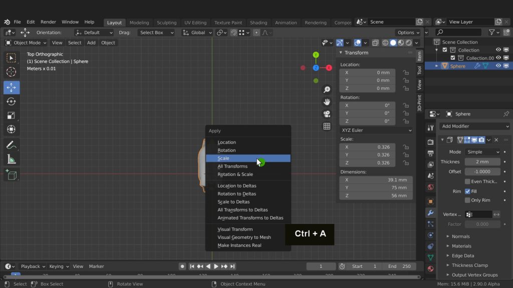 Next press the Tab key and return to object mode. Make sure your scale is applied. That is the scale is 1 in the X, Y, and Z. This is important as we will apply the solidify modifier now and the new wall thickness will be based on the scale value.
