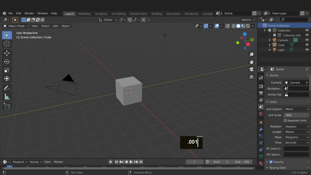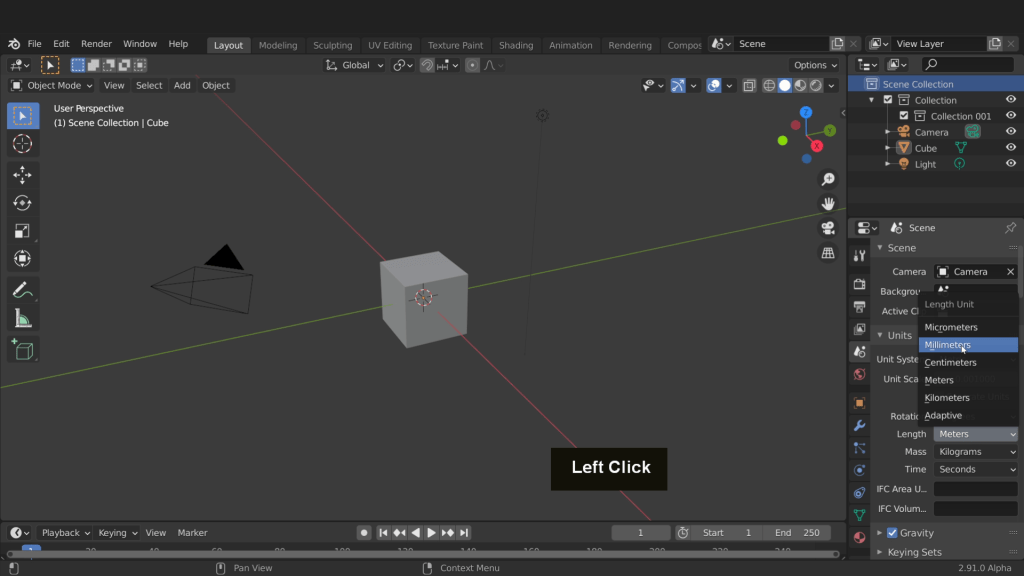 The scene updates to reflect the changes. Any model created in the file now will use this new scale. Also the slicer software used will read the model as millimetre on import. The final setting we can change here is the length setting. Here we can change this to millimetre.