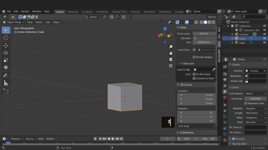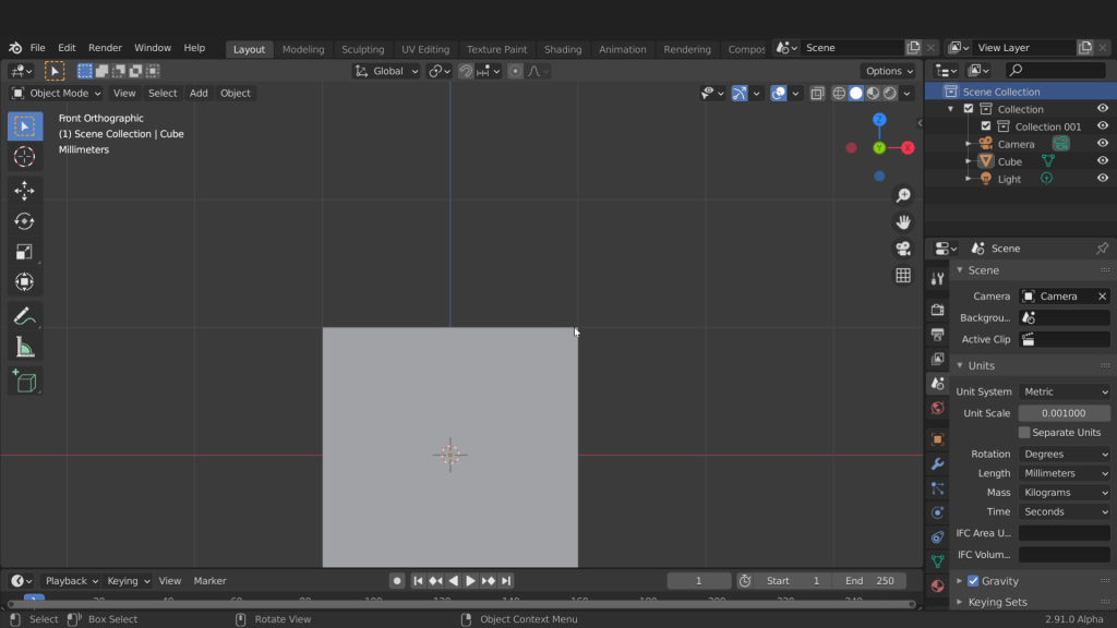 This will allow us input dimensions in millimetre. It will also display all dimensions in millimetre. Back in the scene press Numpad 1 for front view and Numpad 5 for orthographic. The grid is now divided into blocks measuring 1mm. We can see this as the cube is 2mm in length and there are two grid divisions equal to its length.
