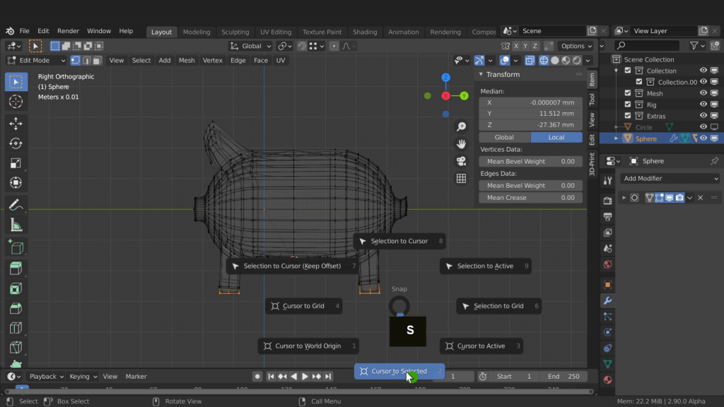 That will parent the inset to the piggy bank. Press Numpad 3 for side view. Press the home key to frame all. Select the piggy bank now. We can set the origin of the piggy bank to be at the lowest point on the model. Press the Tab key and enter edit mode. Press Z and switch to wire frame shading. First we need to bring the legs underneath the body, as they do look a little bit split out. Drag select the front set, then press G, Y and drag these back. Drag select the bottom then drag these to better line up. Repeat that for the back legs and drag them forward and line them up as best you can. Drag select the bottom row of vertices across all legs. Press Shift + S and choose cursor to selected.