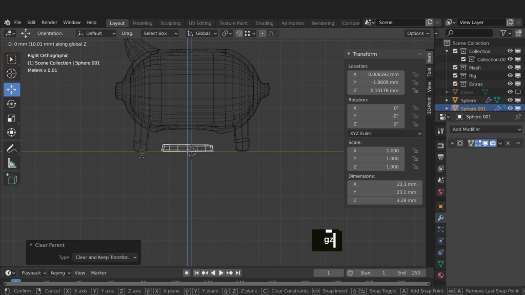 Press the Tab key and return to object mode. Right click and from set origin choose origin to 3D cursor. Right click and choose shade smooth. Press the forward slash key and return to global. Let’s set the origin on the base of the piggy bank first then position both objects on the grid. We do however want to maintain the position of the inset in relation to the piggy bank so we can parent the inset to the piggy bank first. With the inset selected Press Shift and select the piggy bank. Press Ctrl + P and choose object.