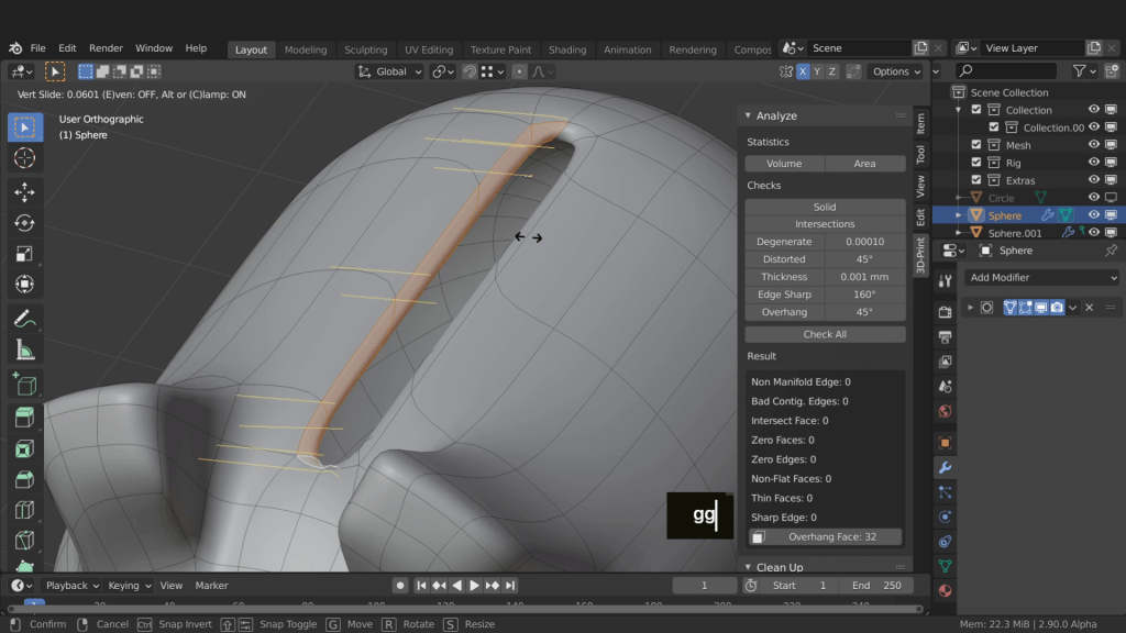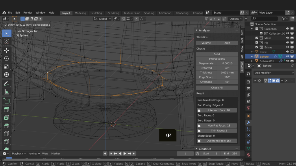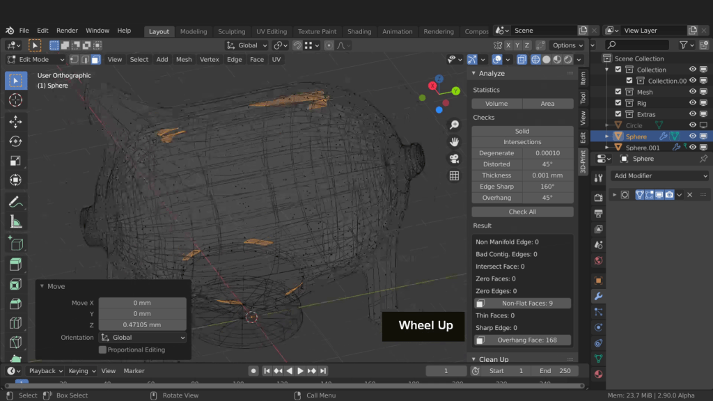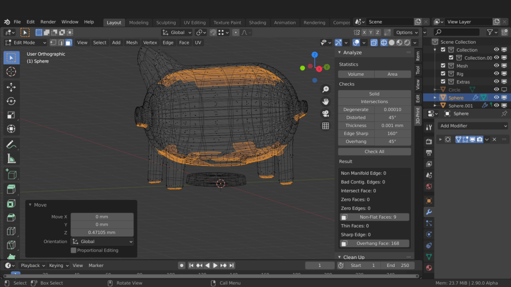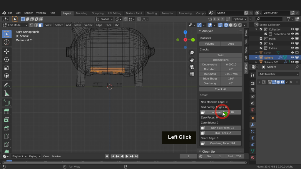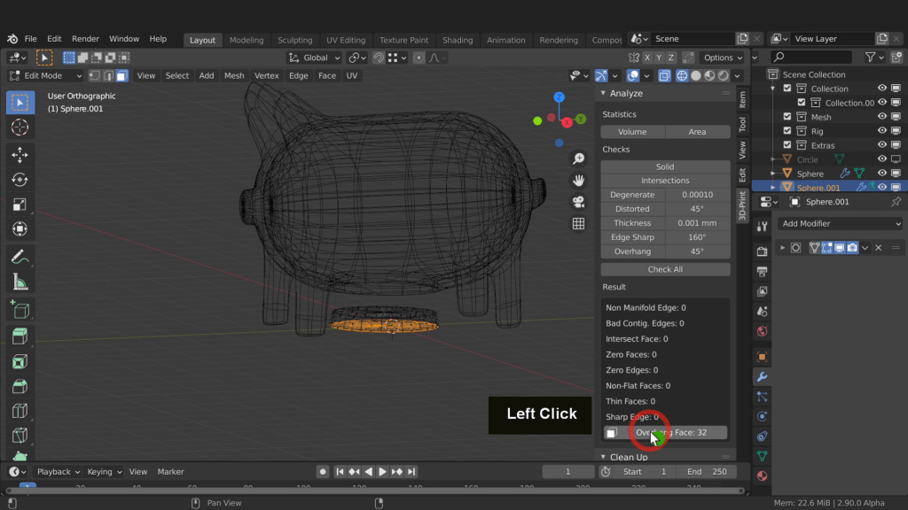Let’s press the Tab key and return to object mode. Select the cap object now and tab into edit mode. We can click check all for this model. The only result showing are overhanging faces and these are on the build plate so they will not be an issue.