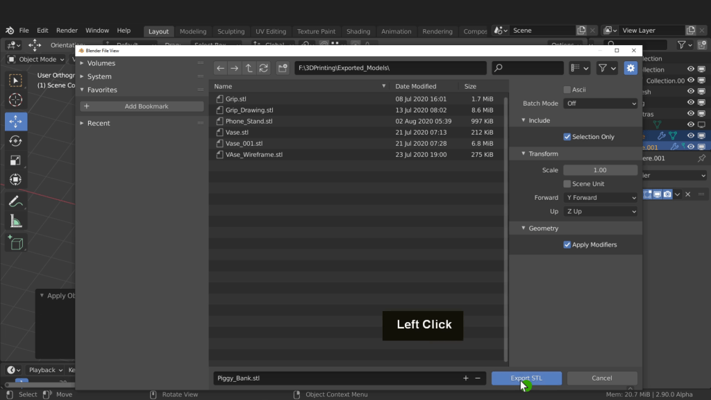 Navigate to a location to save this file. In the name field i can call this piggy bank. Up top check on selection only. That way only what you have selected will be exported. Now down on the bottom click export stl.