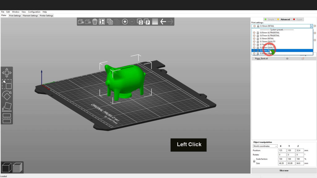Come to file, down to import and across and choose stl. Navigate to where you have saved the stl file. Select it and click open. This is a small model and a good size to begin testing. This can be scaled up once the model prints as expected. In the settings area set this to detail. That will help the inner faces on the top of the model and the material overhang will be reduced by the finer detail. However to speed this print up i can set this to the speed setting.