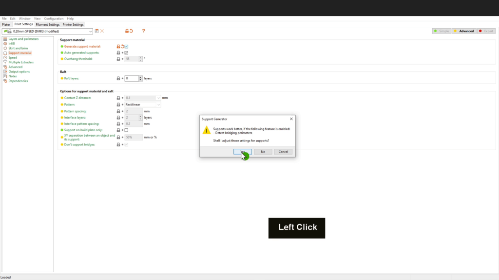 Now come up to the printer settings up top here. Down here in support material i can put a check mark in generate support material. You will need to click yes to update that change.