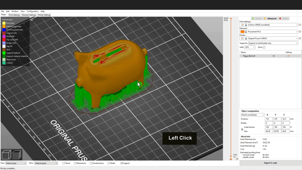 When that completes we can see the green material represents the support material. We can also see there is a little support material inside the model. This will be easily removed after the print has completed. The support material is very light and easy remove. There is most lightly a gap there and the support material was created to fill that gap. The file is now ready to export.