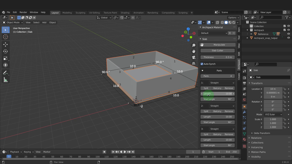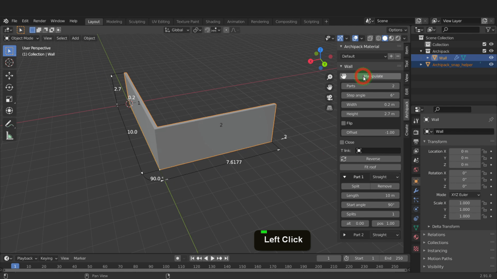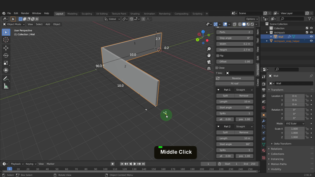 Lets start by clicking and adding a wall object. This gets added at the location of the 3D cursor with manipulator handles to adjust the size and number of walls. A second tab also gets created here called Archipack. Here you can increase the wall count to 2. These can be controlled below in the part section. Here I can input 10 into the length.