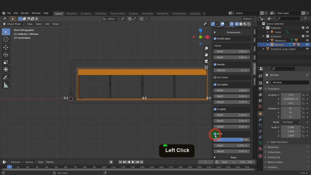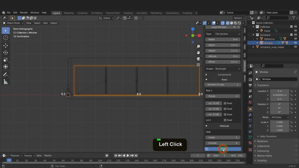 Lets come back to the create tab and add a window. Lets go with this 180 X 210 flat. This also gets added at the position of the 3D cursor. If we press Numpad and come into a front view we can press Z and switch to wireframe. In the item tab input -5000 and centre this up. Now lets open back up the Archipack tab. Increase the width to 9 and increase the panels to 4. Here you can adjust the column offset or add a light portal.