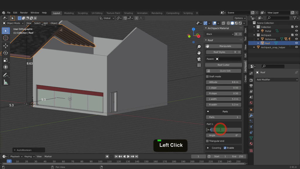 Expand the parts now and increase the length to 10.5. We do need to position this in the scene so switch into a front view. Open the item tab and in the X location adjust this value and drag the roof down a little. Press Numpad 3 and we can drag this back along the Y axis and centre it up on the walls. (Rotate Around). The roof has many more properties from the coverings, hip, gutters, fascia and barge board. These allow for a multitude of different styles to be created.