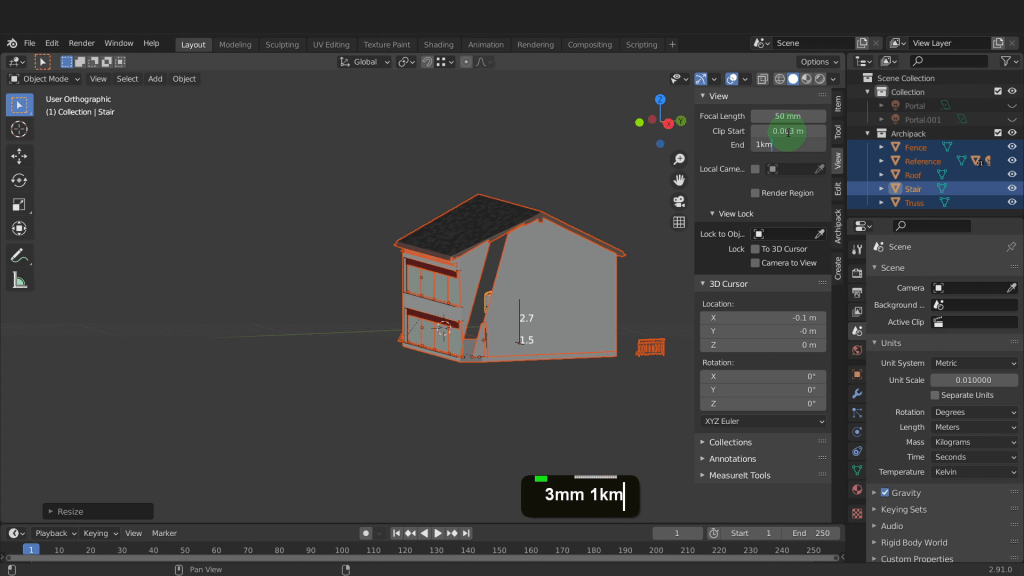 In the view tab lets increase the start clip to 3mm and the end clip to 1 km. That fixes that issue. We also need to apply the non uniform scale. So press Ctrl + A and apply scale. I can select this reference object and press H and hide it. Now we can export all these objects. First switch back to wireframe shading so we can make sure we are selecting everything. Drag select all of these.