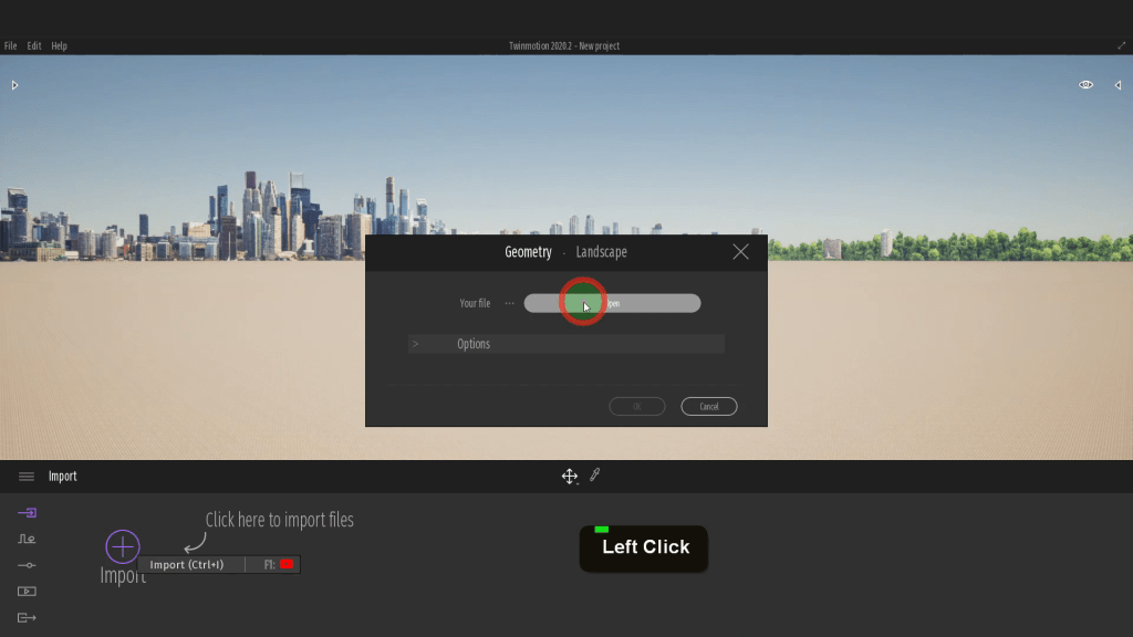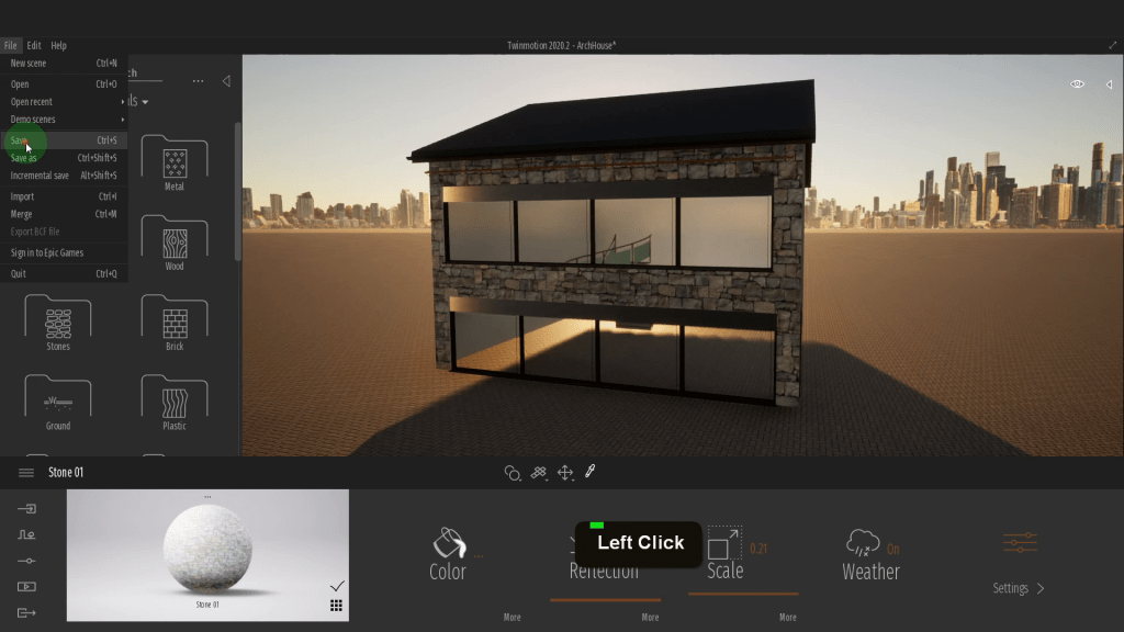 Click import and now click open. Navigate to where the FBX was saved. Click open. The default import setting will be fine so click ok. Use W, S, A and D to navigate around. Press the S key and just reverse back here and come around to the front of the house. One great thing about Twinmotion is the library of materials that’s available.