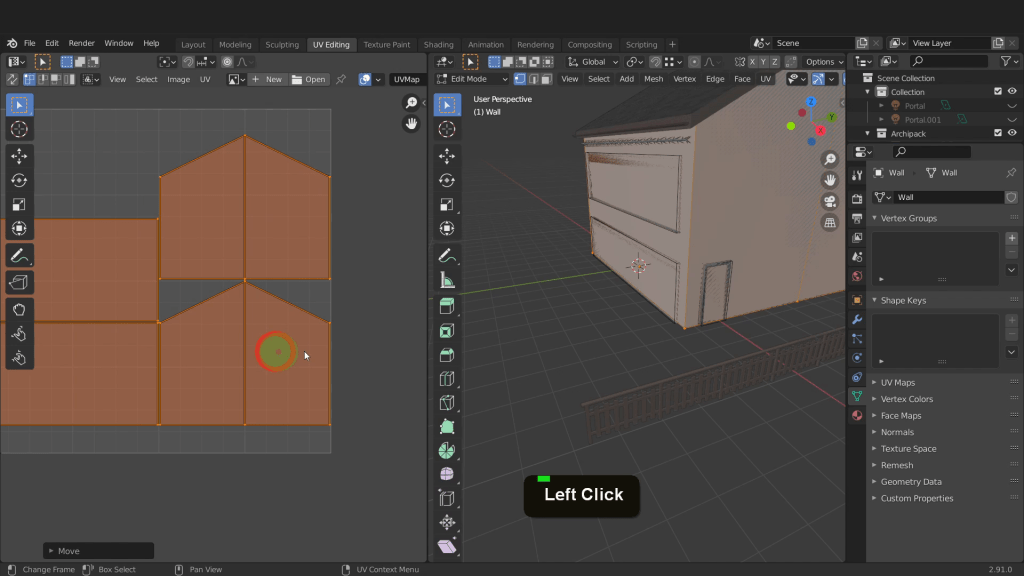 Come to the import tab and just click this refresh icon that appears when you hover the cursor. That will reimport the model with the changes we made in Blender. This wall material doesn’t look quite right. The reason for that are this needs a UV map. In fact any object you want to texture in Twinmotion will need a UV map. This one needs updating. Let’s open back up blender and select this wall object. We can switch into the UV editing tab up top here. I can zoom out. Open the view tab and just increase clipping distance to 1KM. We can do a quick UV unwrap here. Select it all and press U and choose smart UV project.