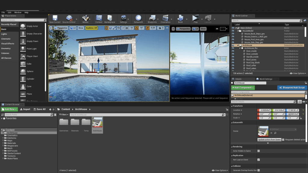 To import the Twinmotion scene come to Datasmith. Navigate to where I have that Twinmotion file saved. Here I can click open. It will ask where to save it and content folders will be fine. Next it wants to know what to import. I can leave the defaults. It’s really just geometry material and textures so I can click import. That imports and throws the camera right out into space. In the Outliner I can select an object and in the scene press F to zoom into it. These are grouped in a folder so by selecting the folder you can rotate and move the model into position.