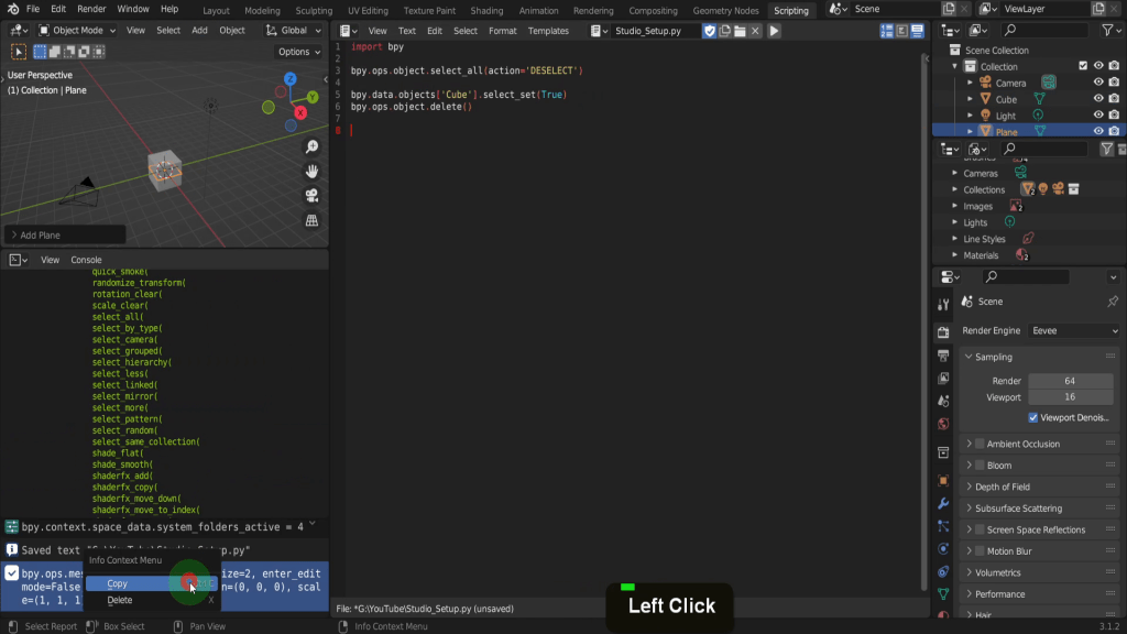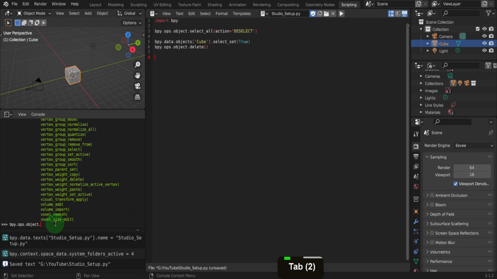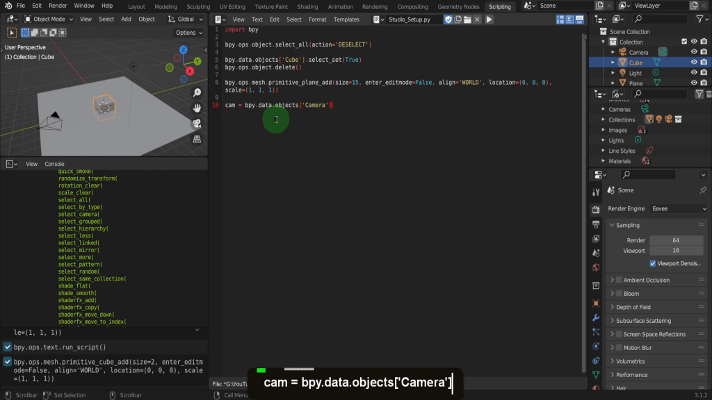This does mean when running the script there must be a cube in the scene. That’s fine here because the default Blender scene will have a cube to delete. The above operators can be found in the console by typing: