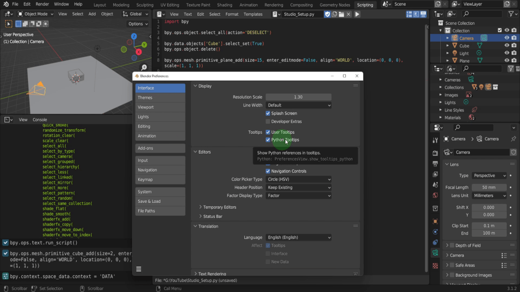 Here we are changing the cameras focal length value to 70. You can see this command if you select the camera and open the camera properties. Hover on the lens field and the tool tip will display the Python command. This setting needs to be enabled in preferences so press F4 and open preferences here. Open the interface tab and in tool tips put a check mark to enable the python tool tips.