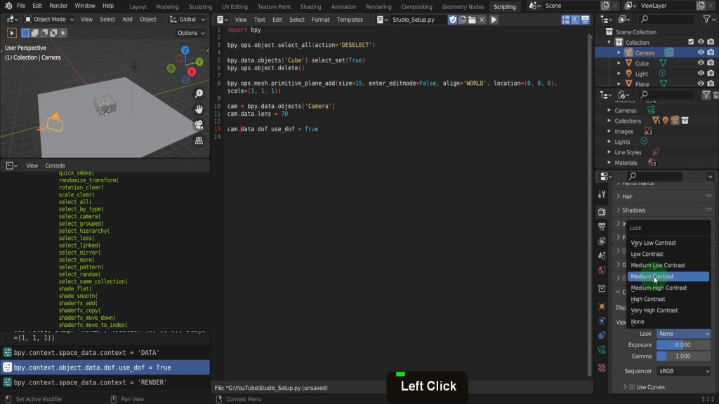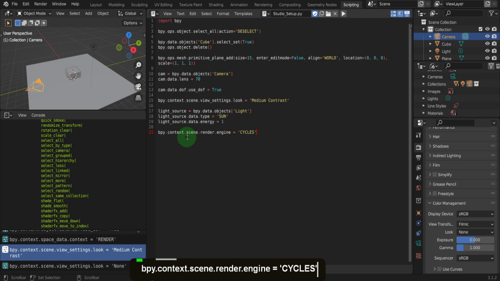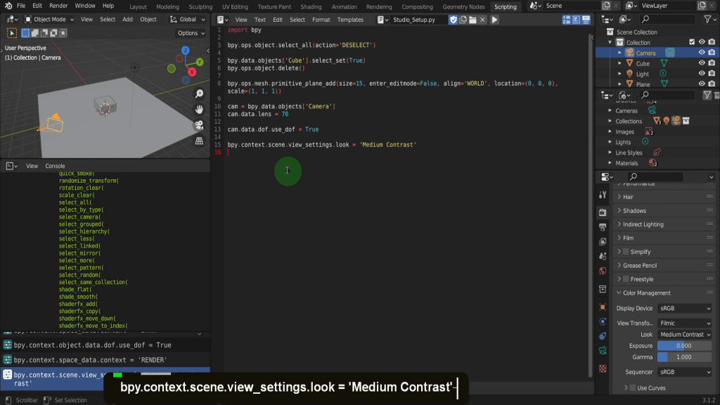 This is a simple true or false property we enable by using True here. An example of changing the scene properties will be here in the render properties tab and the colour management tab. From the look drop down change this to medium.