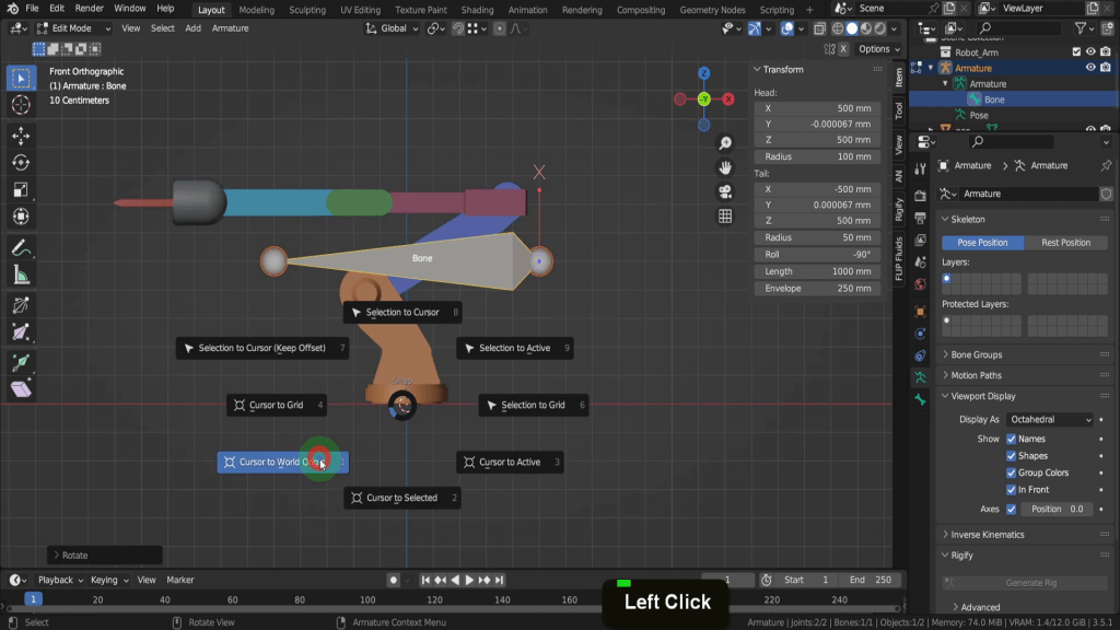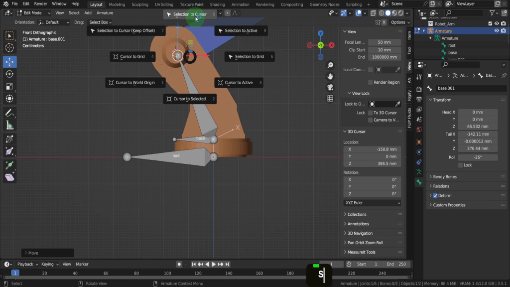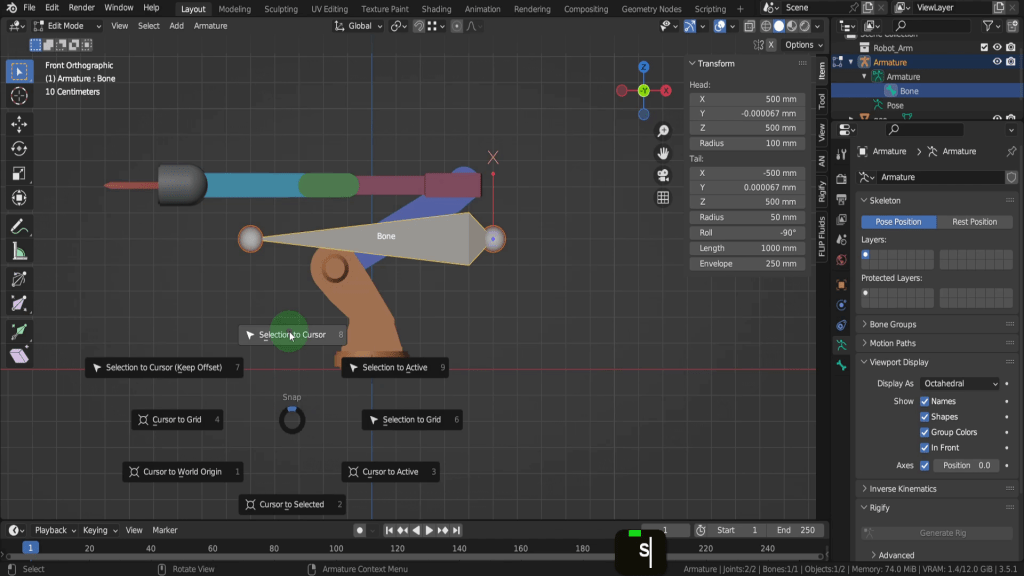 Let’s use snapping to snap the bone to the base of the arm and its origin. Incidently the origin point of this arm is at centre bottom of the its base which is also world zero. Generally you will want the origin of a character or asset at its base and the same position of the armature. We can snap the bone to the base so first if we press Shift + S, we can put cursor to world origin.