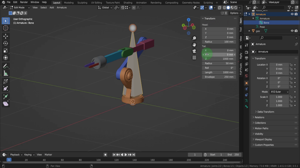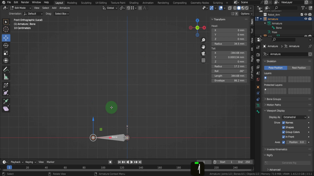 The bones itself is made up of two main components, joints, the head and the tail. If we tab into edit mode we’ll see that a little bit clearer up here in the transform properties. So you have the location of the head in the X Y Z, and the location of the tail with properties for its roll, length and envelope.