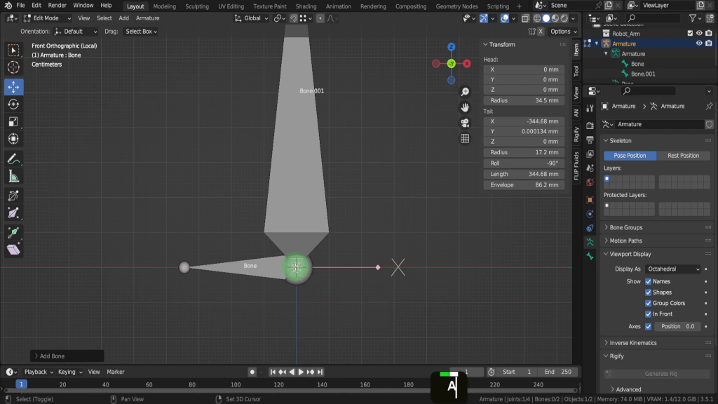 Let’s add the next bone in the chain. This will be used to control this lower arm section. Let’s actually press the forward slash key to isolate this Armature so you can see how this bone gets added.