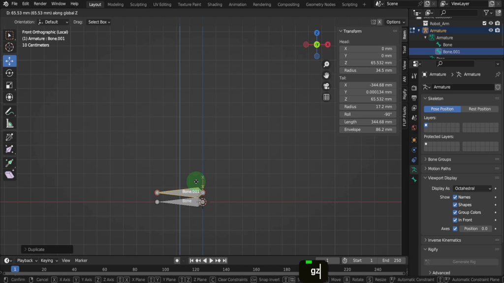Another way to create a bone is to duplicate an existing on. We can press X and delete this bone. Select the root bone and press Shift + D and right click to cancel movement. Then press G Z and drag this up a little.