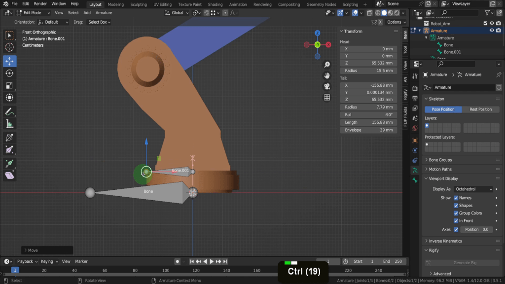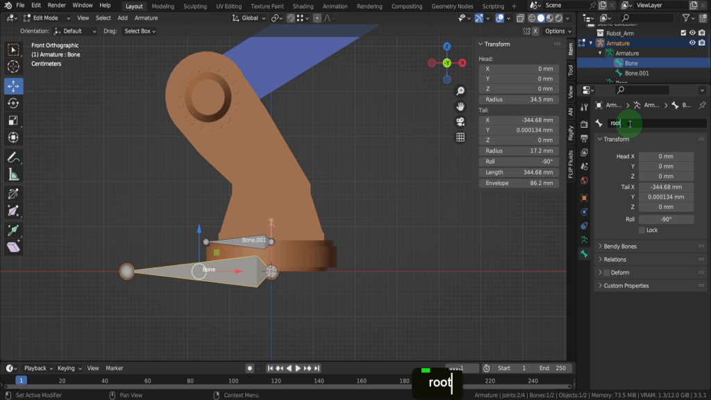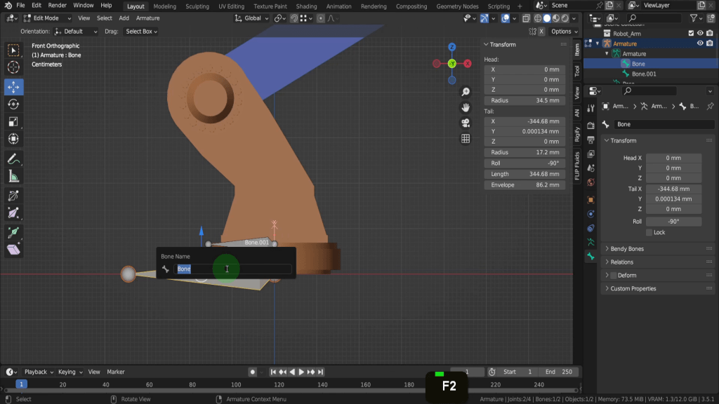 As we added each bone Blender adds a suffix “.001” so each name is unique. That’s helpful but you usually need more descriptive names, especially when binding the joints to the vertices. Knowing exactly where each bone is located and what vertices to bind to is important. If you select the root bone we can press F2.