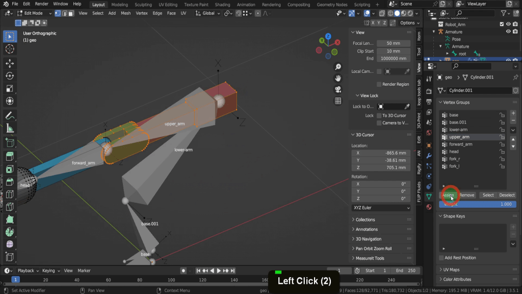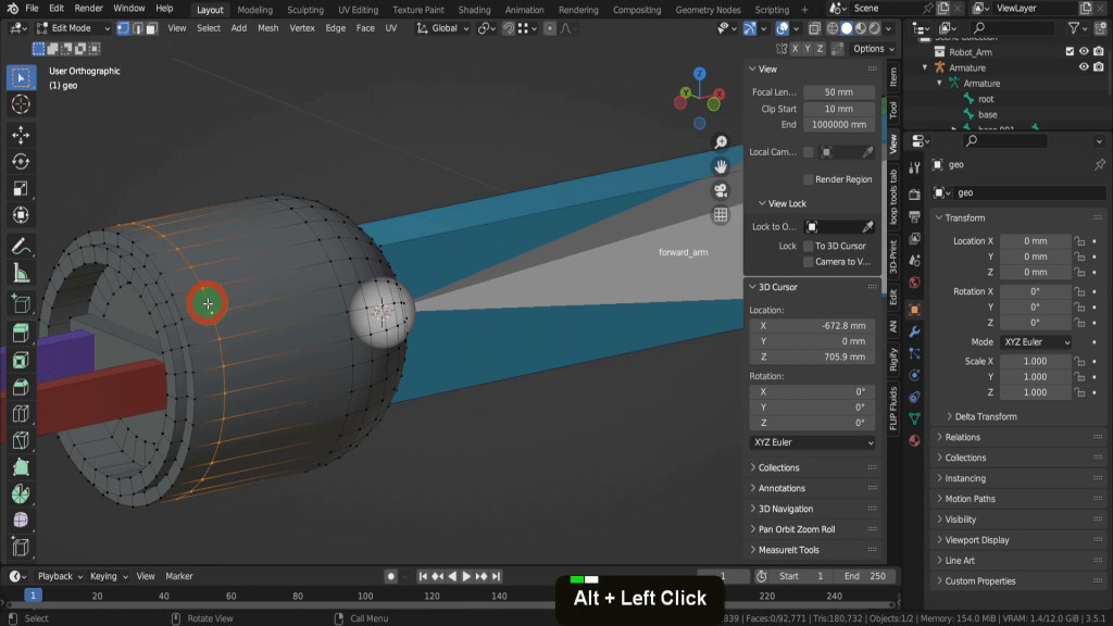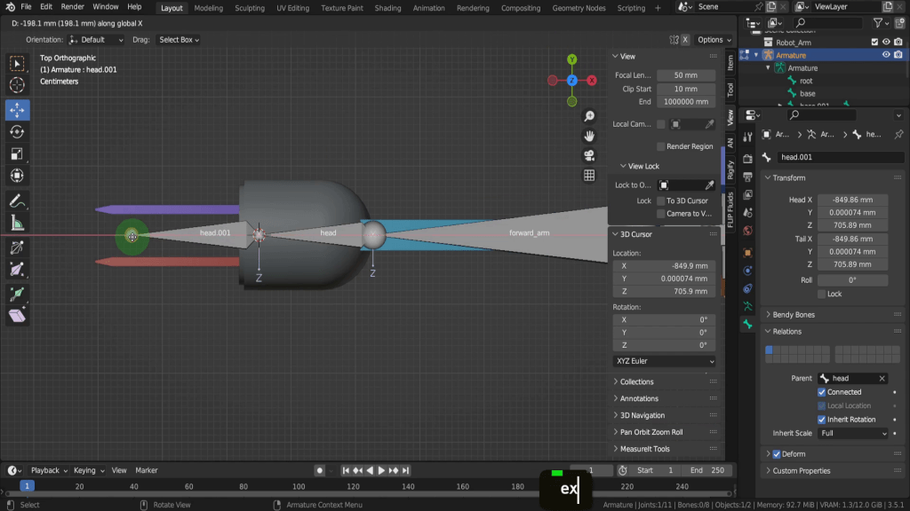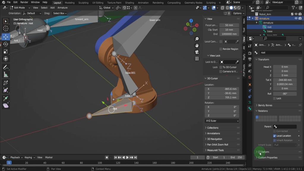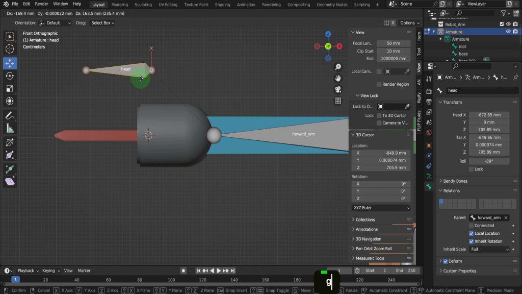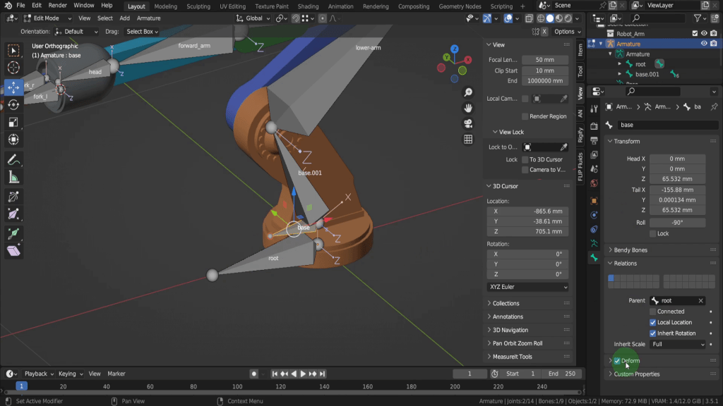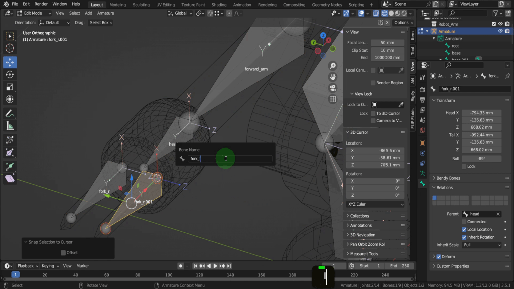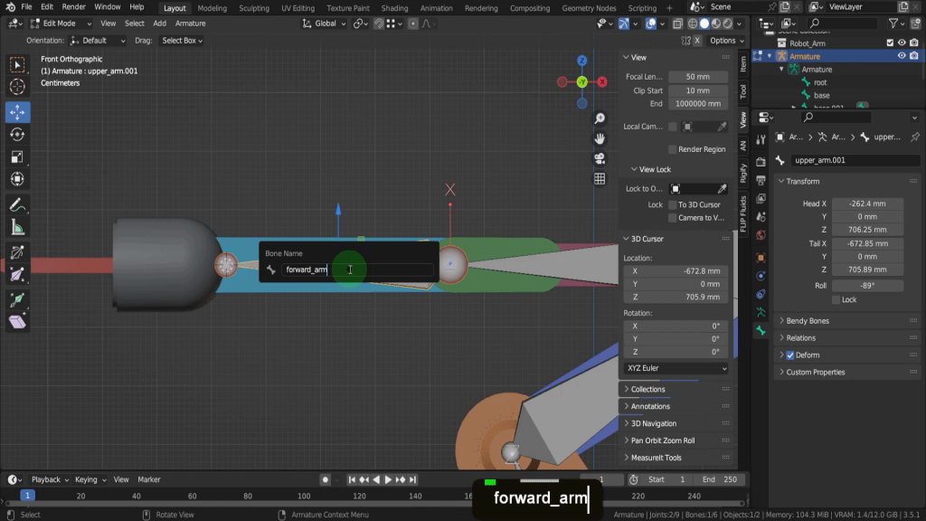 We can tab back to object mode and select the model again. Now let’s tab back in here. For this joint, this vertex here will be the rotation point. Press Shift + S and put the cursor to selected. We can switch back to solid shading. In the view tab if we look at the location Y this should be zero, so update that if its not exactly. So now let’s tab back and we can select the armature again. Now tab in here. Select this joint. Press E Y and drag this forward. Shift + S and put selection to cursor. Select it now and press F2. We can rename this “forward_arm”.