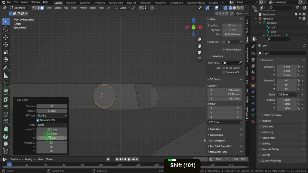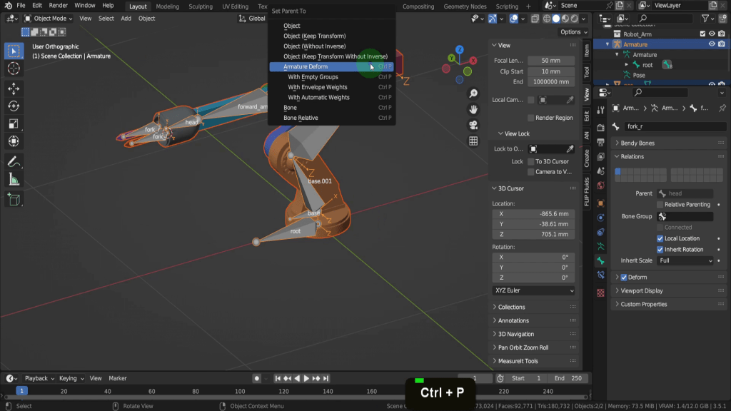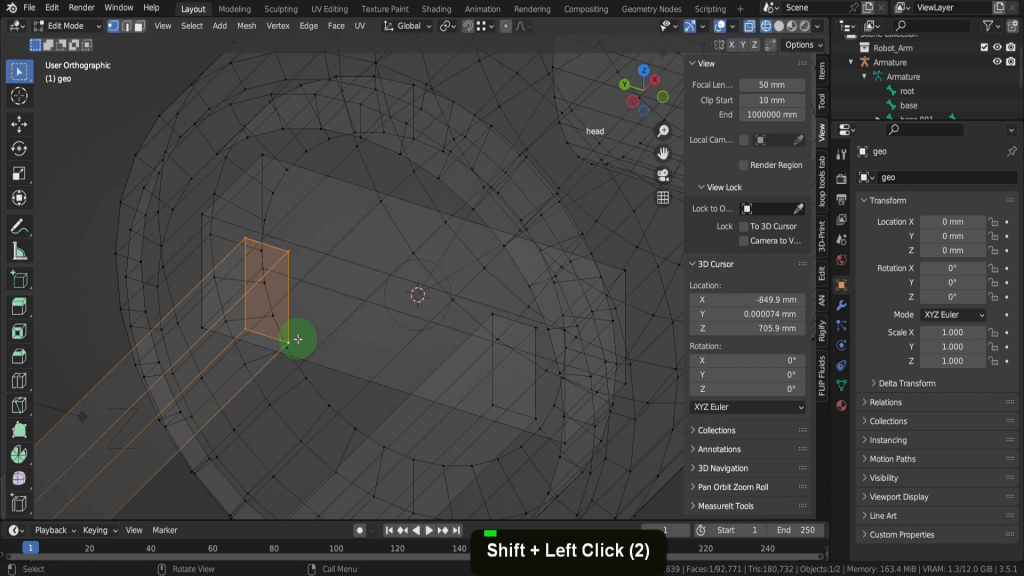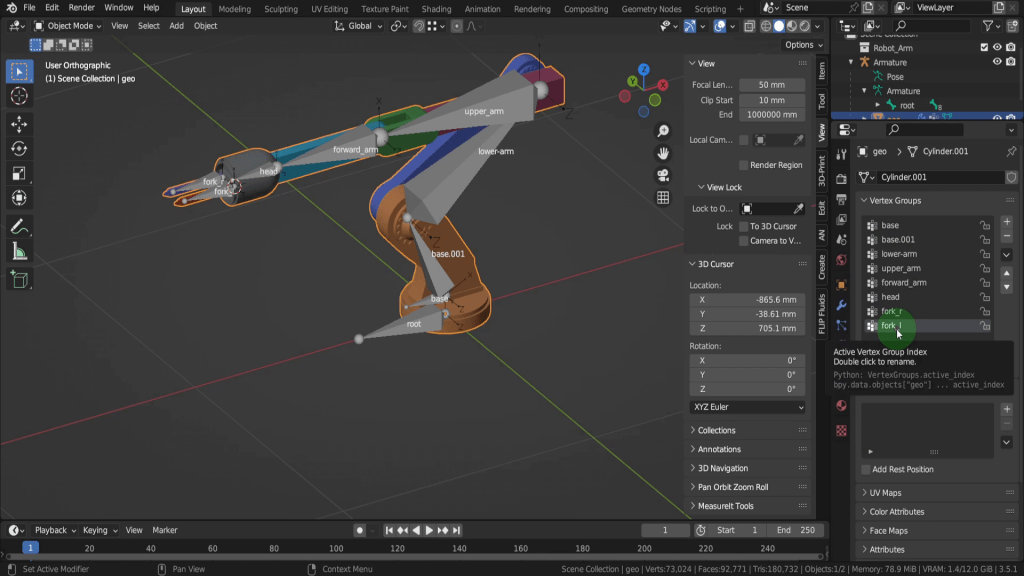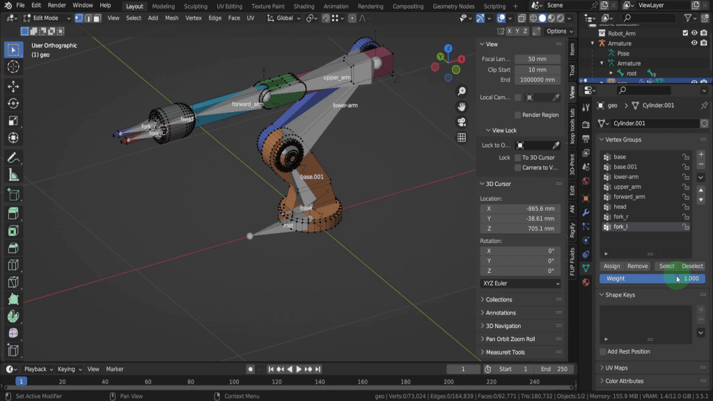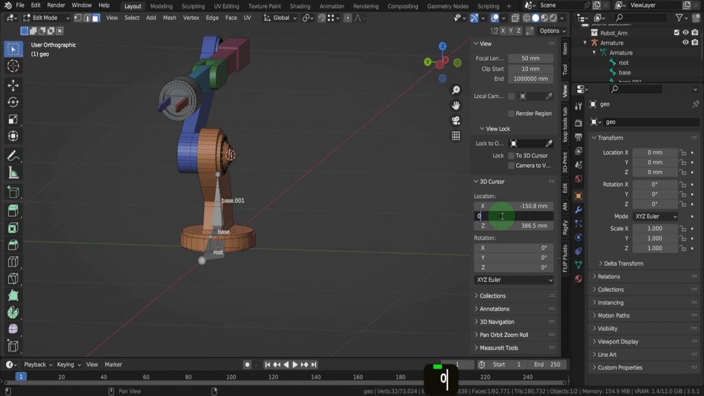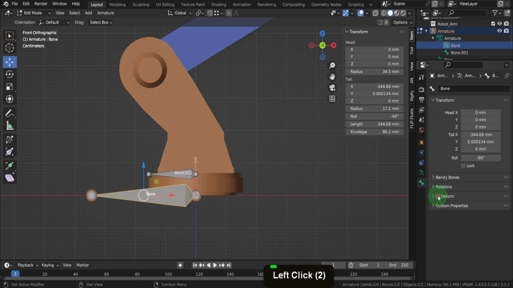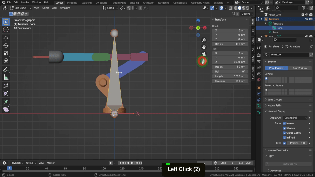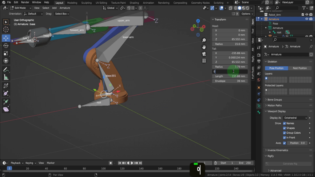 We can tab back to object mode and select the model again. Now let’s tab back in here. For this joint, this vertex here will be the rotation point. Press Shift + S and put the cursor to selected. We can switch back to solid shading. In the view tab if we look at the location Y this should be zero, so update that if its not exactly. So now let’s tab back and we can select the armature again. Now tab in here. Select this joint. Press E Y and drag this forward. Shift + S and put selection to cursor. Select it now and press F2. We can rename this “forward_arm”.