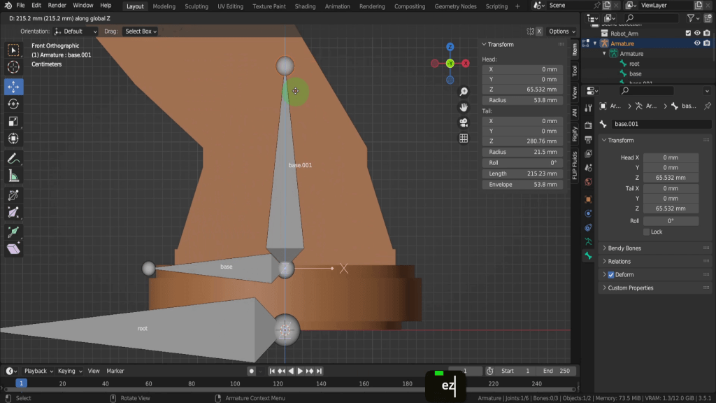 This next step can be known as skinning, weight painting or binding and it’s the process of associating the vertices, edges and faces of an object with the control objects, in this case the armature, and the individual bones. Each vertex is assigned a weight for a particular bone and how much influence it will have. Its a form of parenting, and once each bone is bound will deform a section of the mesh. So the base bone will control this base section here once the vertices are assigned, and then each section up along will will be controlled by the assigned bone. Before we move on to that process let’s first make sure the parenting hierarchy is correct with our rig. So if we begin with the root bone, in the relations tab this parent field is empty as this is the root bone and the first in the chain. Deform is also unchecked.