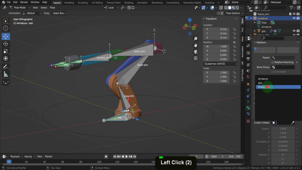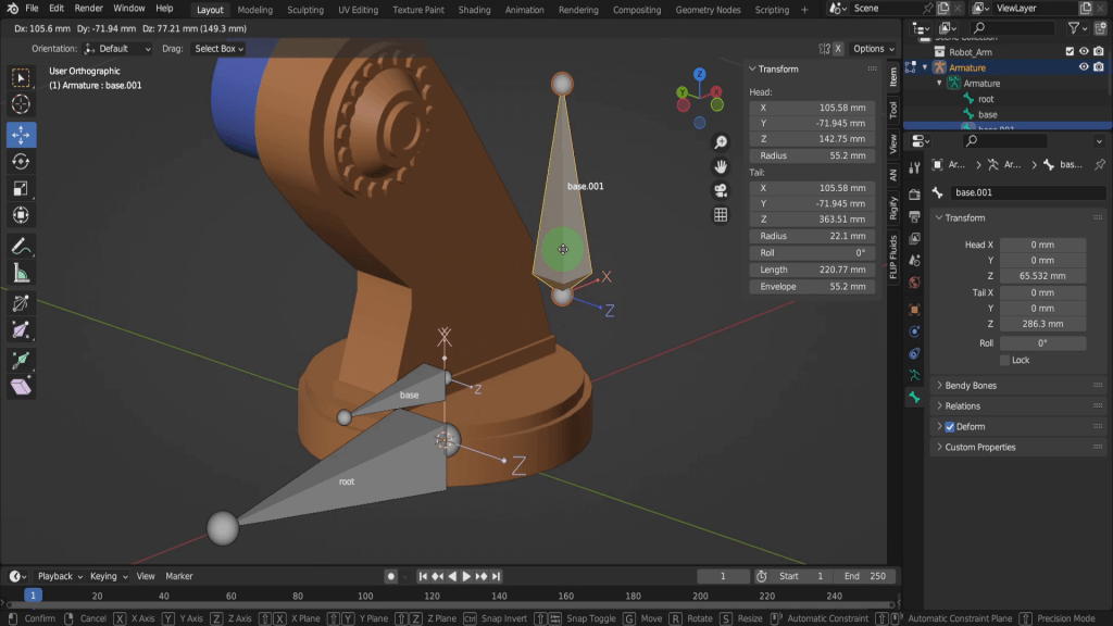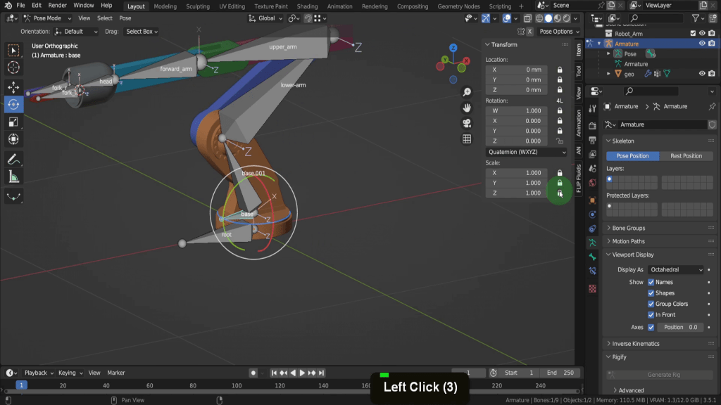 Now you can overwrite that by clicking and dragging in the fields here, but you usually don’t animate this way. The next bone, base.001 we don’t want to have the ability to move, rotate or scale at all, so we can click the lock icon and lock all location, rotation and scale transforms here.
