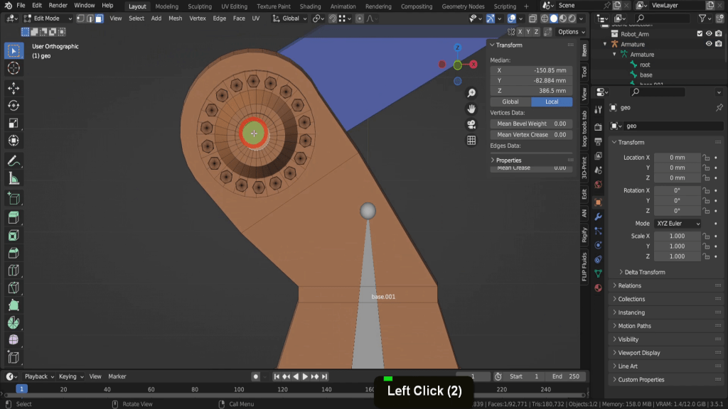 That moves the head into the correct position and what will be the rotation point for this next section of arm. Now we need the placement position for the next joint so let’s tab back to object mode. Select the model and tab in here. Let’s zoom in close here. We can Alt select this edge of faces here.