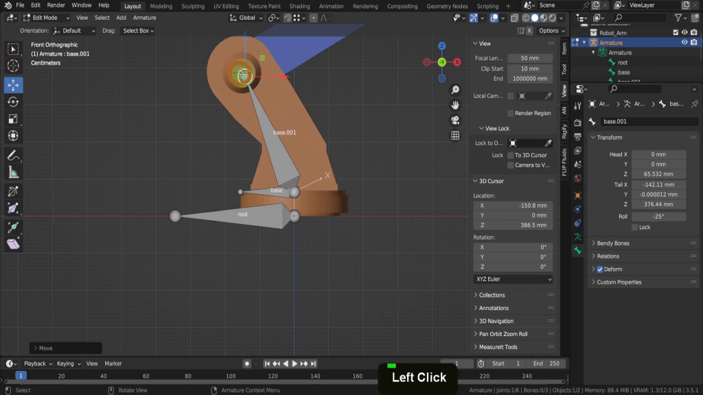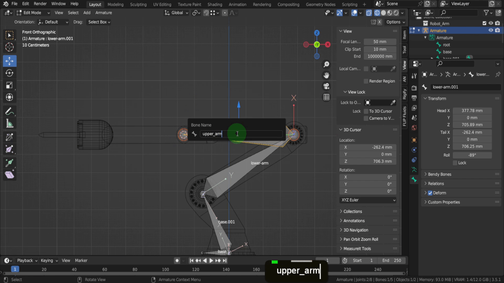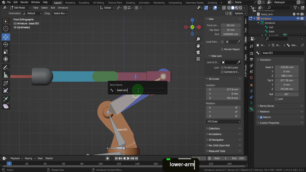Press Shift + S and we can put the cursor to selected. Similar to before we need this at zero on the Y-axis and aligned with our armature. So let’s come to the view tab. In the Y location field let’s input zero. Now we can tab back to object mode. Select the armature and let’s tab in here. Let’s come into a front view as it’s easier see where the bone is placed. We can press E to extrude, press X to restrict it to the X axis and we can left click and just place that here. Press G and drag up close. Then we can snap this into position so press Shift + S and choose selection to cursor. Lets select the bone. Press F2 and rename this “lower_arm”. The previous bone “base.001” is fine name this as we won’t be binding this to any vertices. Its just a visual for the bone hierarchy.