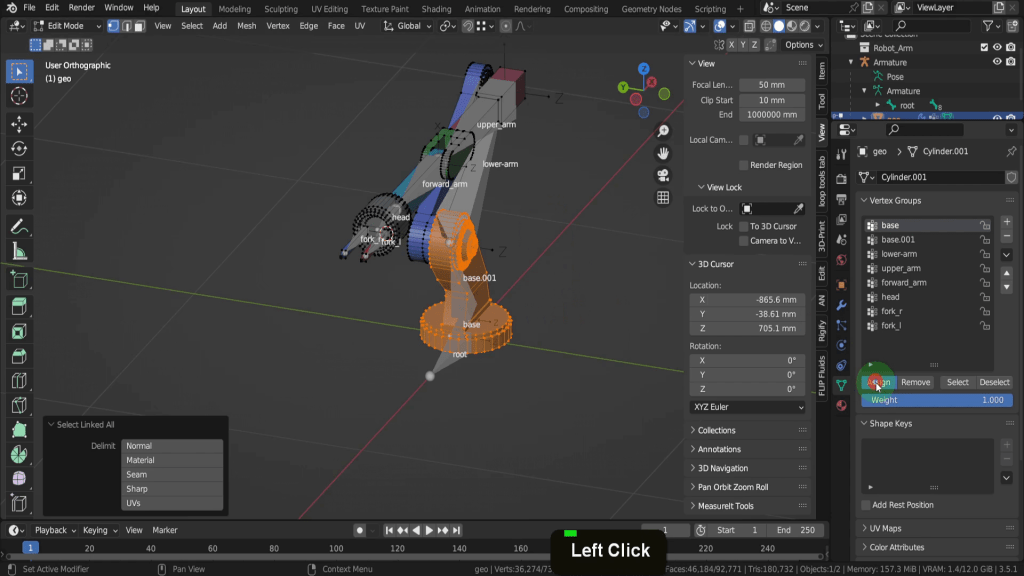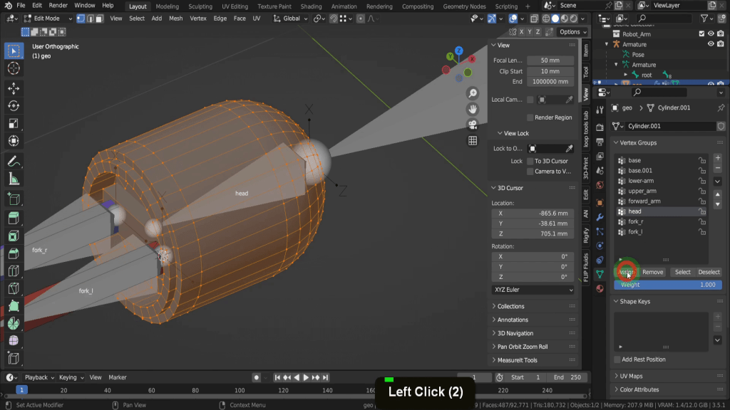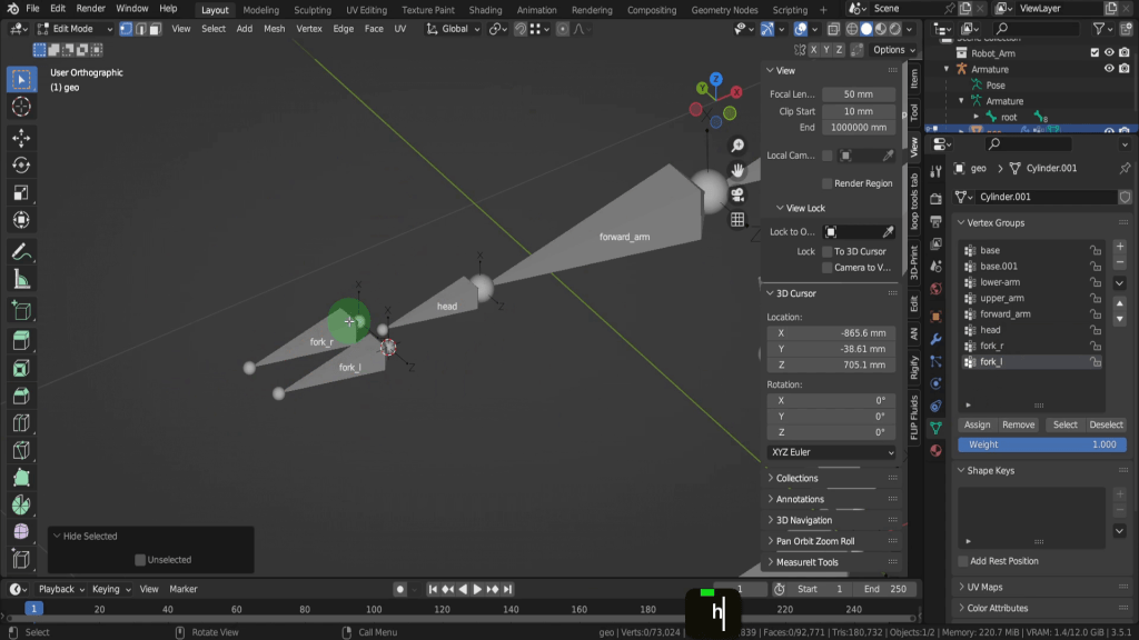 No press H to hide. That leaves fork r and Fork l so let’s hover on the vertices of fork r and select these. Select fork r bone and assign these vertices. Press H to hide this. Let’s quickly repeat that for fork L and we can assign these vertices. Then press H to hide this. So once all your vertices are hidden you can be sure they have been assigned to some bone in the Armature.