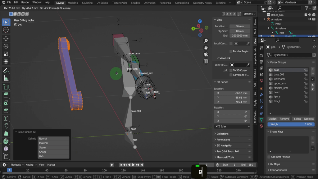 Let’s begin with the base bone. With it selected let’s come into the scene and we can hover on parts of the base object and press L to select them. We can also maybe Shift + drag select this section here with the individual nuts and bolts. Then press Ctrl + L to select linked and make sure all of these are selected. If we press G we can see this whole objects moves away as one.
