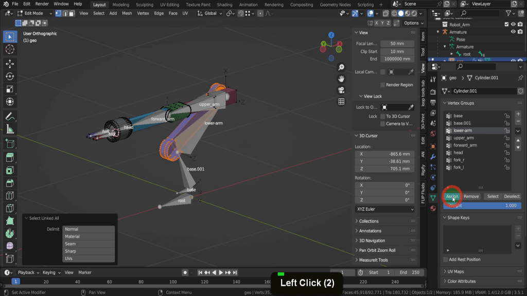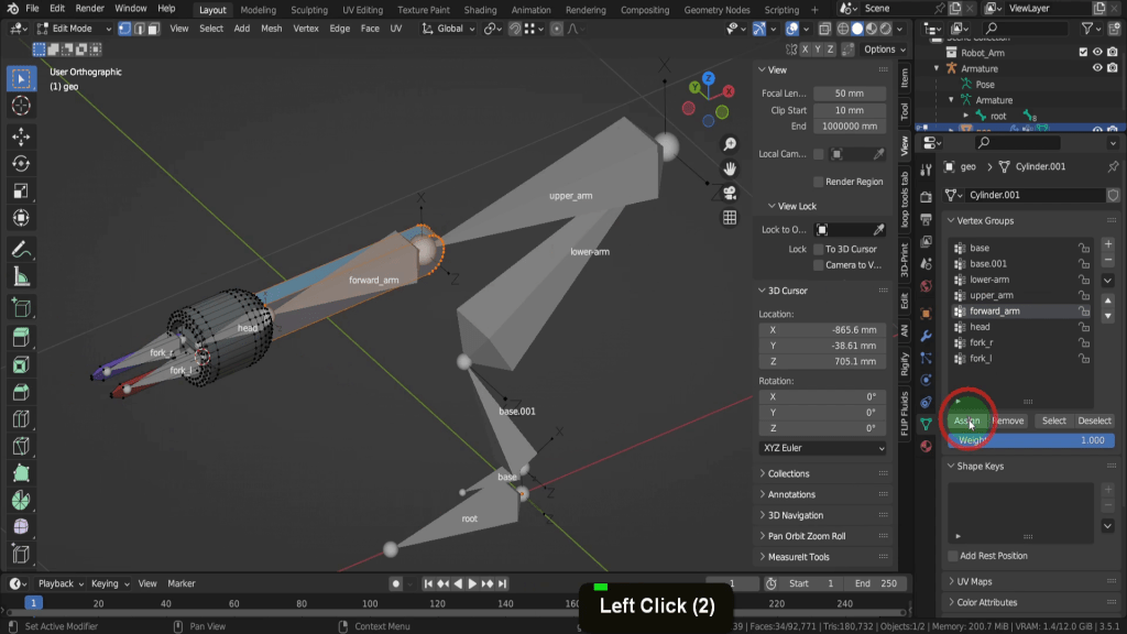Press H and hide this selection. For the next one let’s again press L to select this. We can then select the forward arm and click assign.