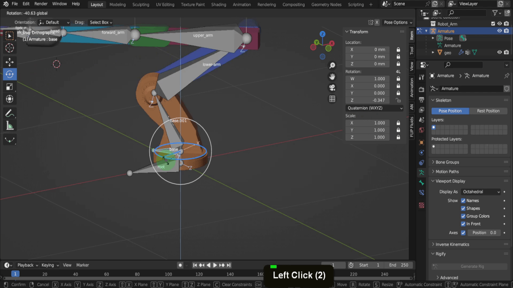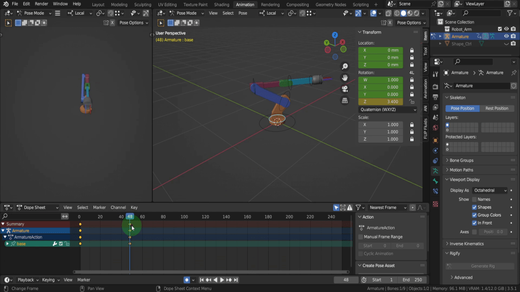 Let’s drag the scrubber onto frame 48 which is two seconds. Two seconds as the default frame rate in a Blender scene is 24fps. We can select the base control. Then on the sidebar in the Z rotation field let’s rotate this around. So maybe 3.4. Now you’ll notice because we have auto keying enabled new keyframe has been added with the change in the controls rotation property. So if we drag back and forth along the time line the arm will rotate back and fourth between those two key frames.