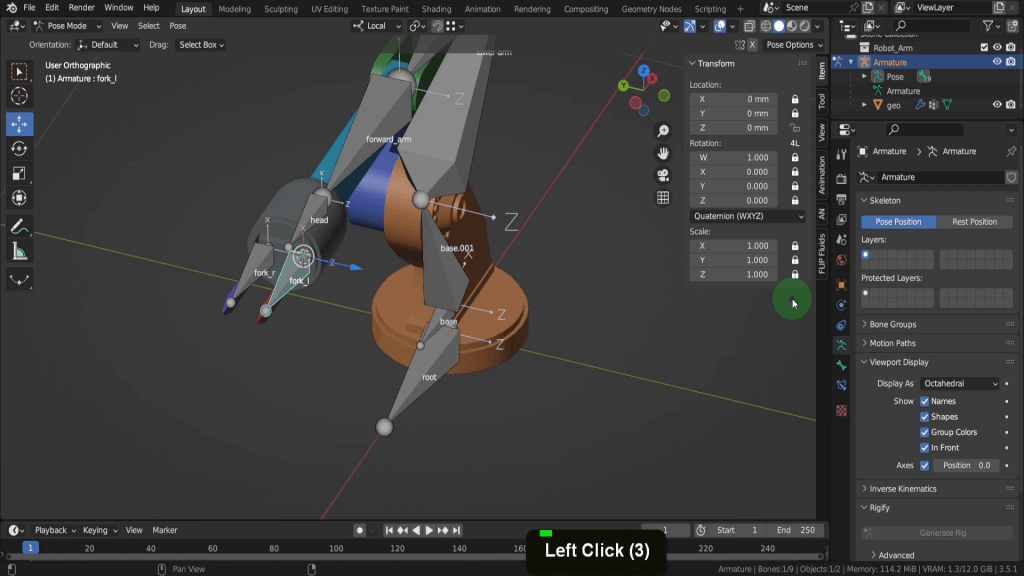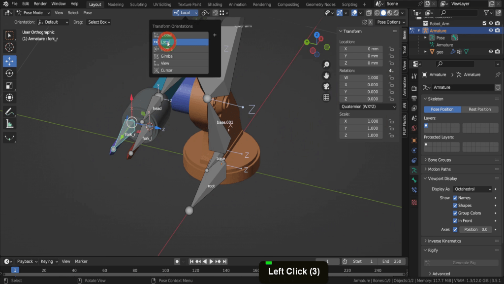 We can move up along the chain to the next bone. This will rotate around the Z axis. So every other field can be locked. So if you press R to rotate it’s ever only going to rotate on this axis. Same thing with the next one, we can lock all of these except for the Z axis. So that way when you press R these are only going to rotate around the correct axis. We can continue and lock the rest up to the forward_arm. The head and fork bones will be a little different. So for the fork bones we can switch to the move tool. And up top in the transform orientation drop down let’s switch this to local.