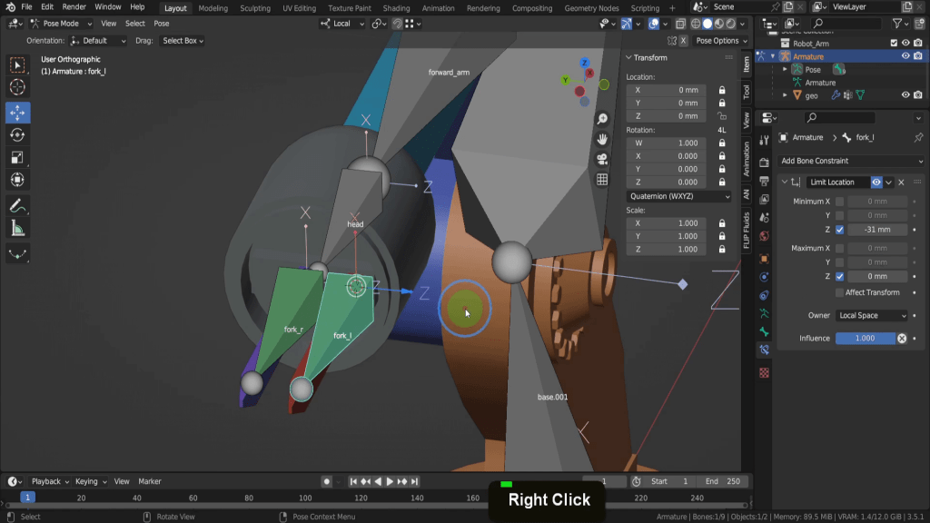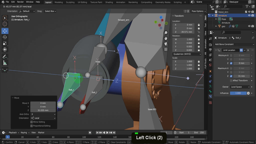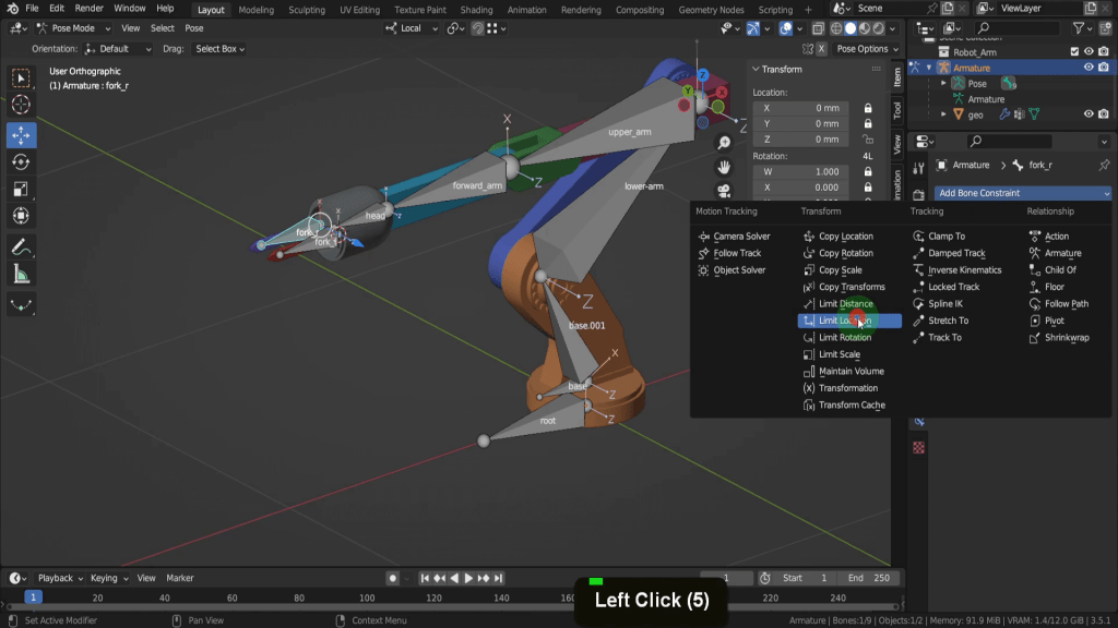 While this is useful can we limit the range somehow. Well that’s where constraints come in handy. Constraints are a powerful feature that allows you to control and limit the movement, rotation, or scaling of objects, bones, or other elements. In the case of the forks here we can use the limit location constraint. This constraint limits the location of an object within a specified range on one or more axes. To add one let’s open the bone constraint properties tab here. Its easy get confused with the object constraints tab but this will apply the constraint to the entire object and not the individual bone. So from the constraint drop down we can choose a limit location.
