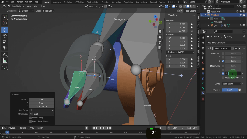 We only want to affect the Z axis so put a check mark to enable both these fields. This is also set to world space so lets switch this to local space. In Blender you’ll will often encounter these two coordinate systems: local space and global space. Understanding the difference between these two spaces is crucial for rigging and animation. Global space refers to the coordinate system of the overall scene in Blender. When you move, rotate, or scale an object in global space, you are changing its properties based on the world’s coordinate system. Local space is specific to each individual object or bone. It represents the coordinate system relative to the object or bone’s origin and orientation. When you move, rotate, or scale an object in local space, you are changing its properties based on its own coordinate system. Here local space allows us manipulate the bone based on its own local orientations. So the values we enter now will be relative to the bones own location and rotation coordinates. Let’s just disable the limit location constrain from a moment and we can see this visually. Right now the minimum we want this to move the bone across is zero. So we don’t need it to go beyond its starting position here on the negative Z. If we select the move gizmo and move this to centre, we don’t want to move beyond centre, which in this case will be 31 on the positive Z. So lets input 31 in the maximum Z field. I tried this earlier so I know 31 works here.