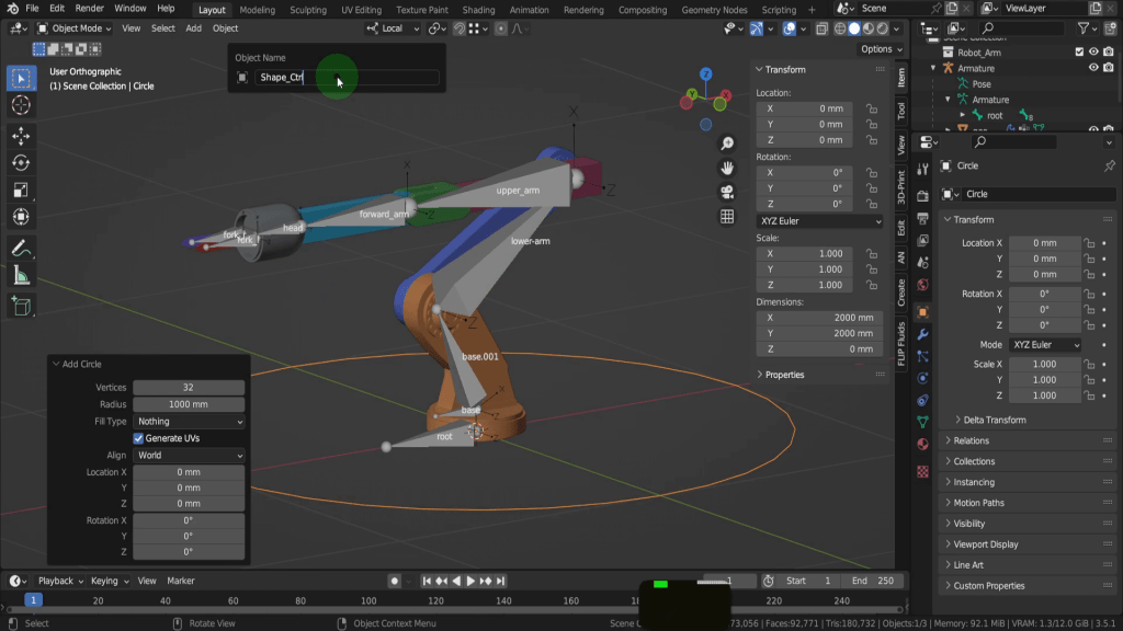 Why not work along and add a constraint to the remaining bones and constraint the movement along the X axis. The next stage to the rigging process are to add rig controls. These are user friendly controls to facilitate the animation workflow. So rather that having these large chunky bones we can add smaller less intrusive shape in their place. Now you can go to great detail in the shape of these controls but for this example we will keep it simple and use a circle. So let’s press Ctrl + Tab and come back to object mode. We can press Shift + S and put the cursor to world origin. Then from the add menu in mesh let’s add a circle. We can press F2 and rename this “Shape_Ctrl”.