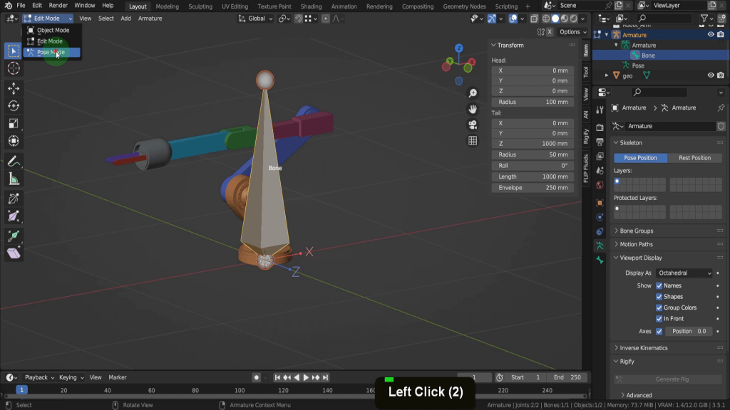 This assigns a weight of 1 the select vertices to the base bone. So to check the selected vertices are fully weighted we can first tab back to object mode. Select the Armature and then from the mode menu let’s switch into pose mode. Pose Mode is a mode used for working with armatures and posing rigged characters or objects. It allows you to manipulate bones in the armature to create different poses, animate the character, and control deformations of the mesh. In Pose Mode, you can move, rotate, and scale the bones of an armature, create keyframes for animation, and use various constraints and drivers to control the bones’ behaviour. If we select the base bone in here. Press R Z this bone will rotate the vertices we assigned. So the entire base of the object will rotate, scale or move along with the bone.