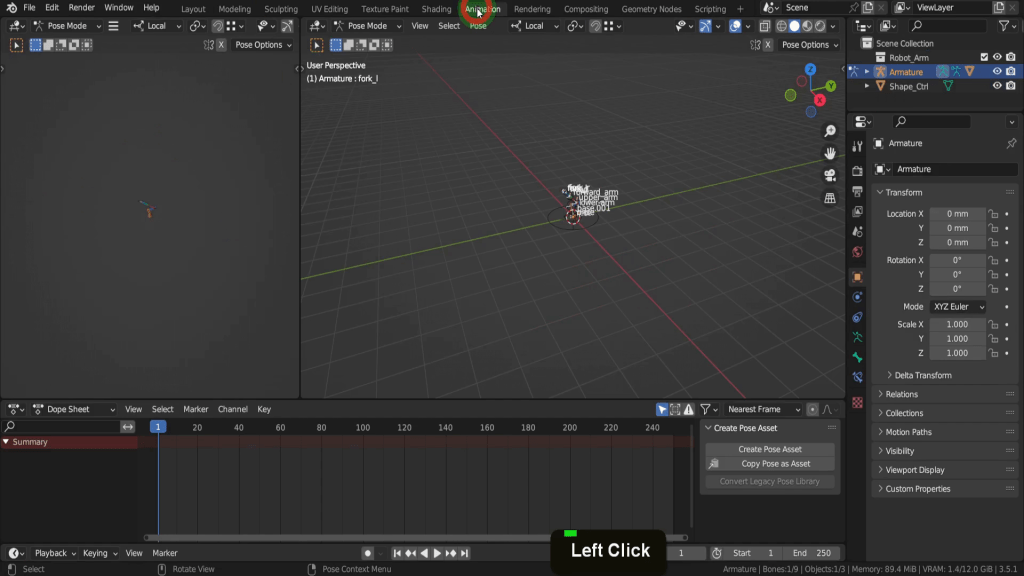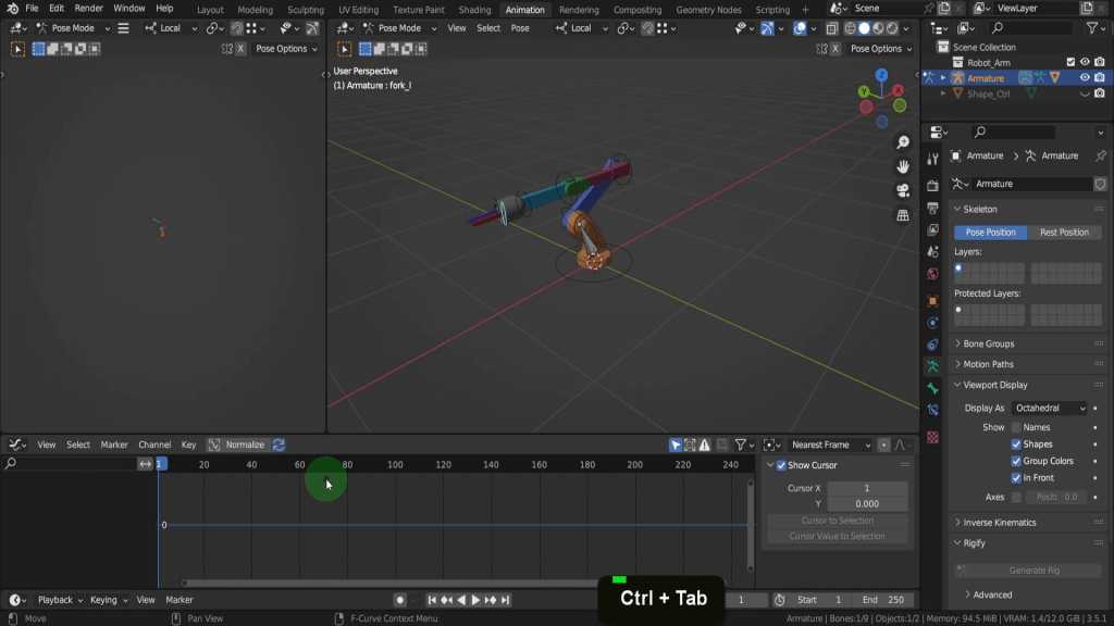 The Animation tab is a dedicated workspace for the animation process. It provides a pre-arranged layout of editors for creating, editing, and previewing animations. On the top right is the 3D Viewport. Below this is the timeline editor. The controls can be used for navigating and setting keyframes during the animation process. Above this is the dope Sheet. This provides a visual representation of keyframes and their timing and allows you edit and adjust keyframes easily. With the cursor in The Dope sheet if you press Ctrl + Tab this toggles you into the graph editor. The graph editor displays and allows you edit animation curves (F-Curves) for more precise control over object properties and interpolation.