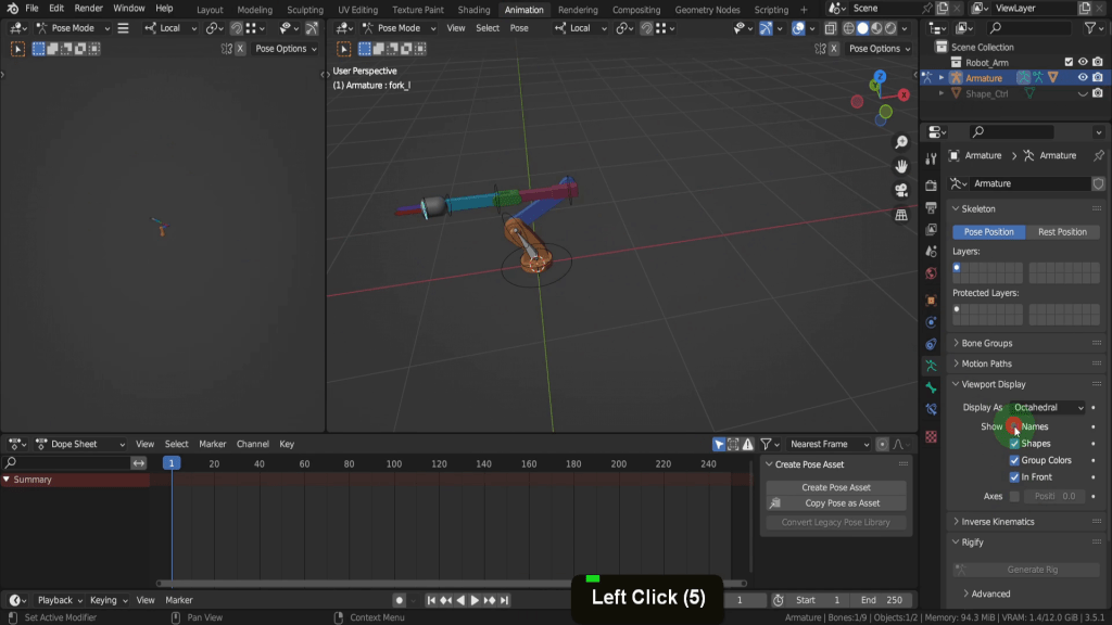 We can zoom into the model. In the Outliner let’s hide the visibility of the shape control object. In the object data properties tab let’s uncheck axes. We can also uncheck names just so we have less clutter in the viewport.