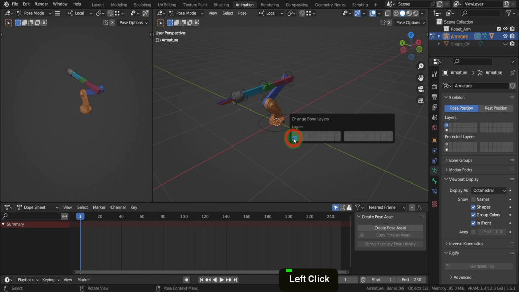 Let’s press Ctrl + tab and switch back to The Dope sheet. Then there is the properties editor and the Outliner. We also have a second 3D view here with some of the scene overlays switched off. Let’s open the object data tab for a moment. Here we have bone layers and we can move this bone base.001 to a hidden layer. So in the scene press M and we can move this to the layer beneath as we won’t be needing it.