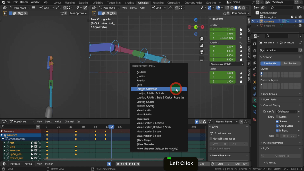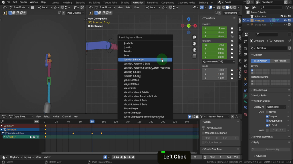 Let’s drag the scrubber back to frame 80. Then we can select each of the forks. Press I and add a location rotation keyframe here. Do this for both. We need them open at this stage.